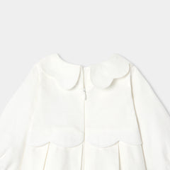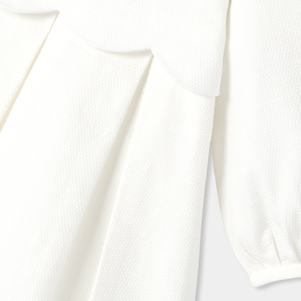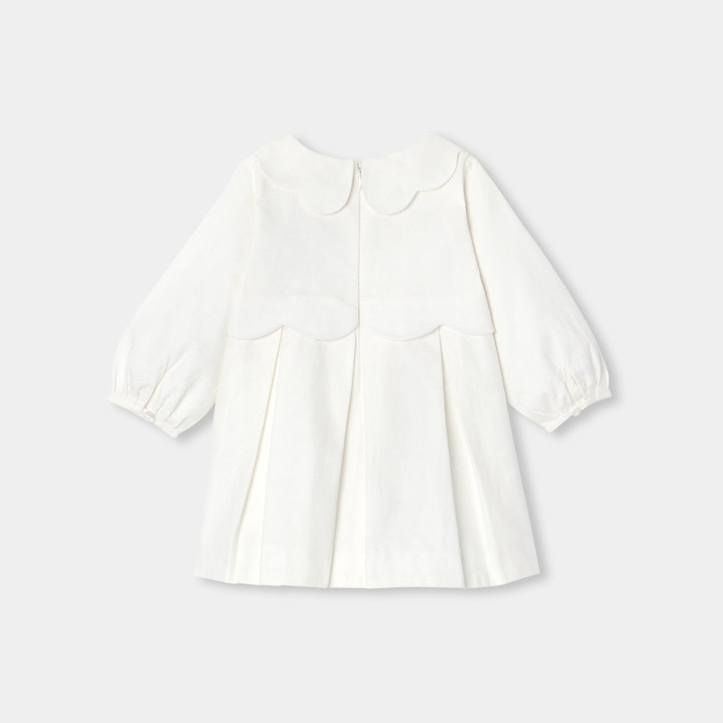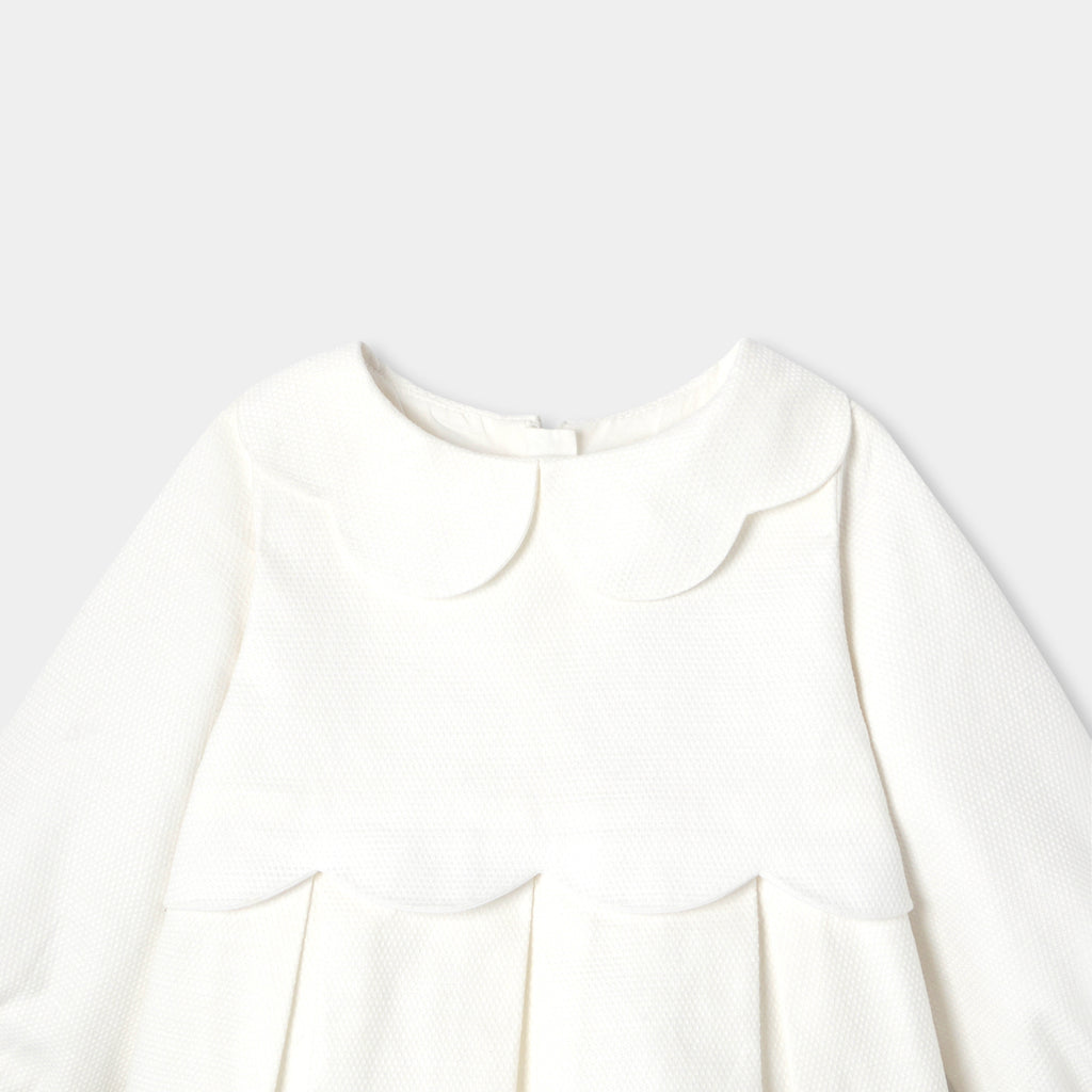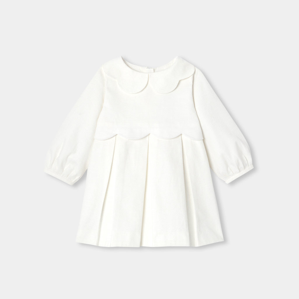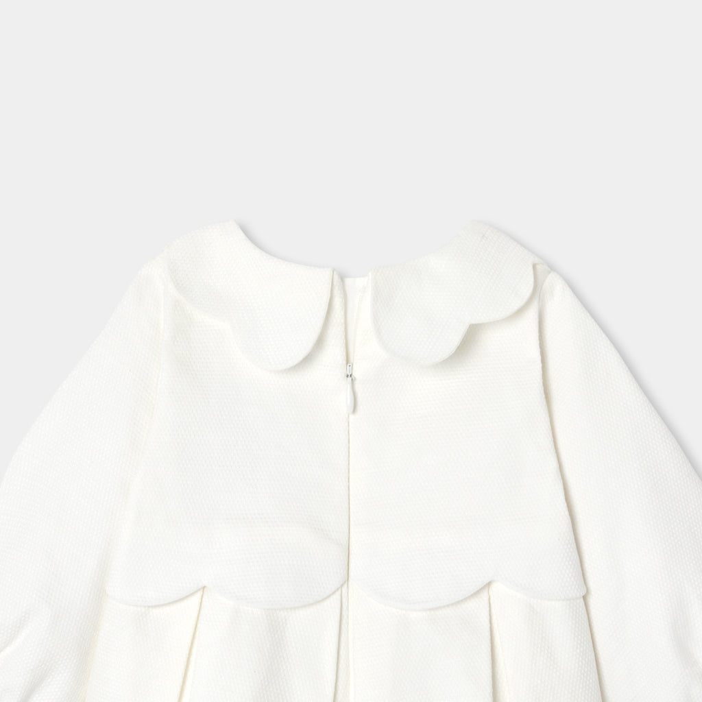 ジャカディの技術が詰まったシックなワンピース。スカラップ襟とウエストの幅広プリーツが目を惹きます。袖口のギャザーとアンダースカートのプリーツのディテールがボリューム感を添える、チャーミングな一着です。ベビーシューズに合わせれば、特別な日の装いにぴったり。