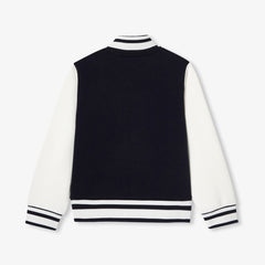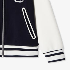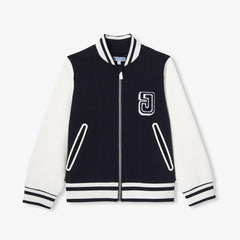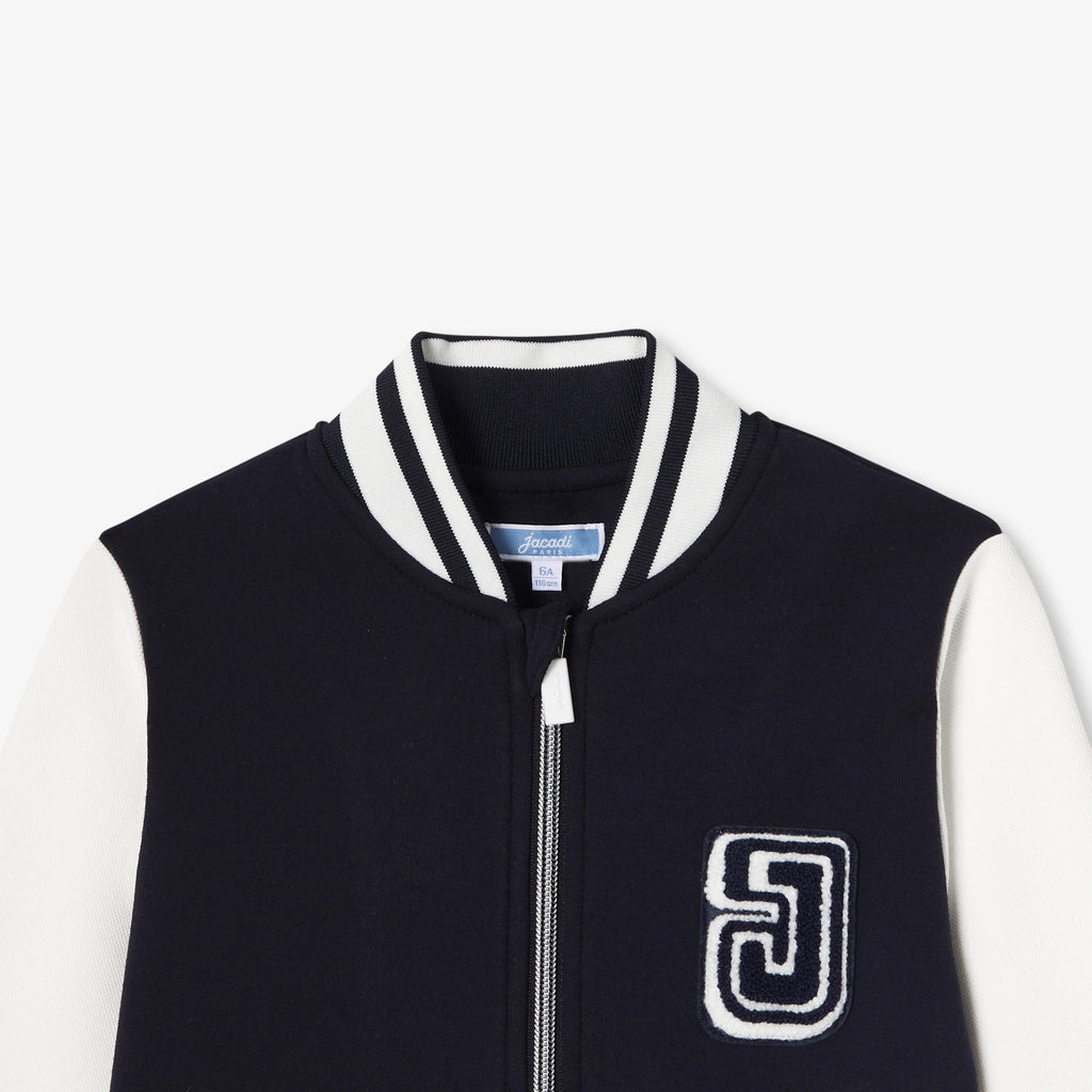 ボンディング加工のピケとジャージー生地の組み合わせで柔らかく快適な着心地を実現。コントラストの効いた袖とストライプのリブ編みディテールが特徴のカレッジ風ジャケットです。
