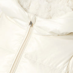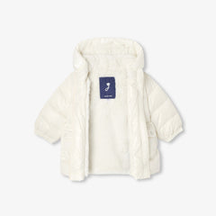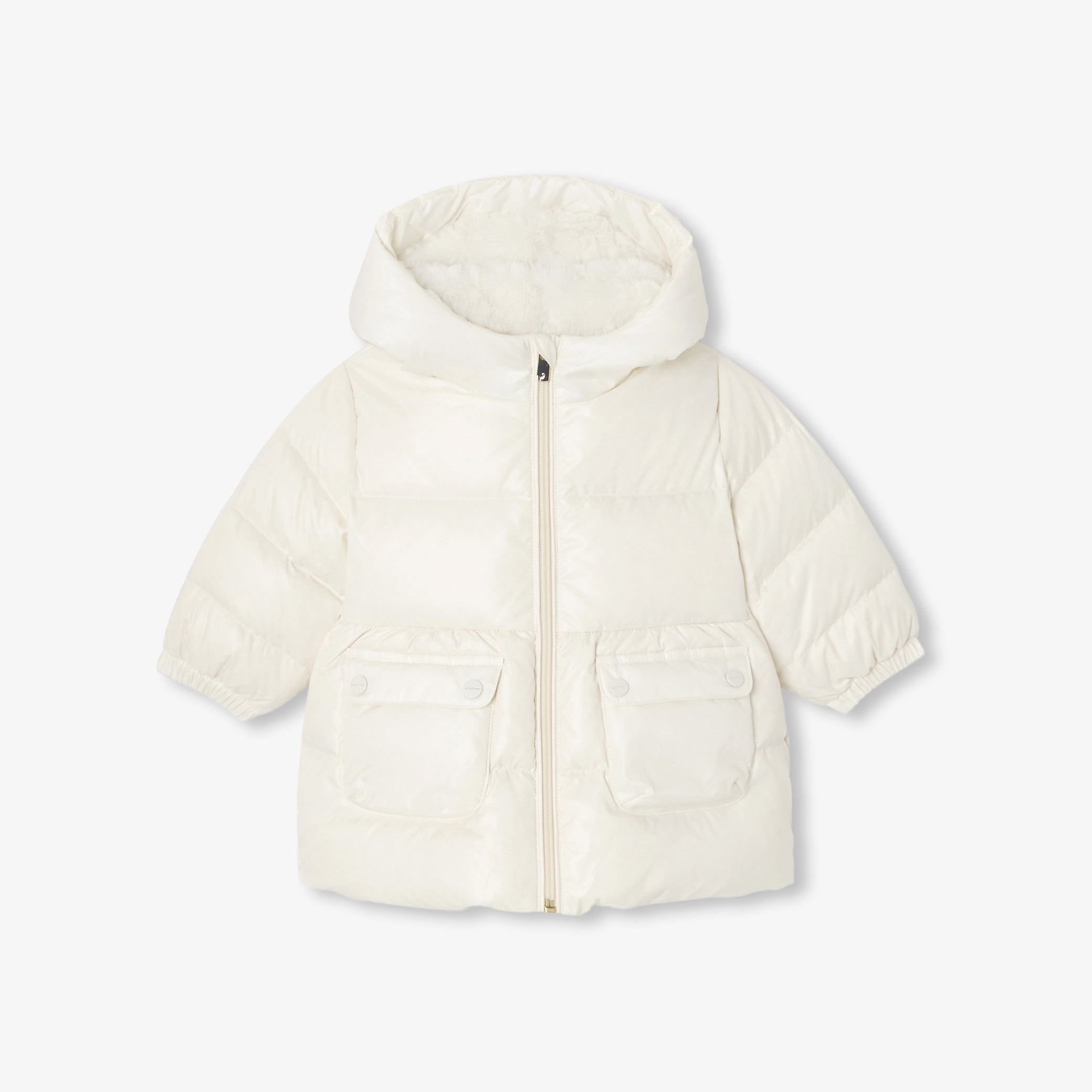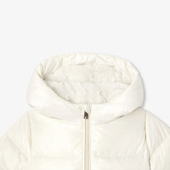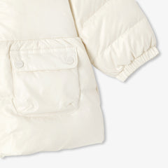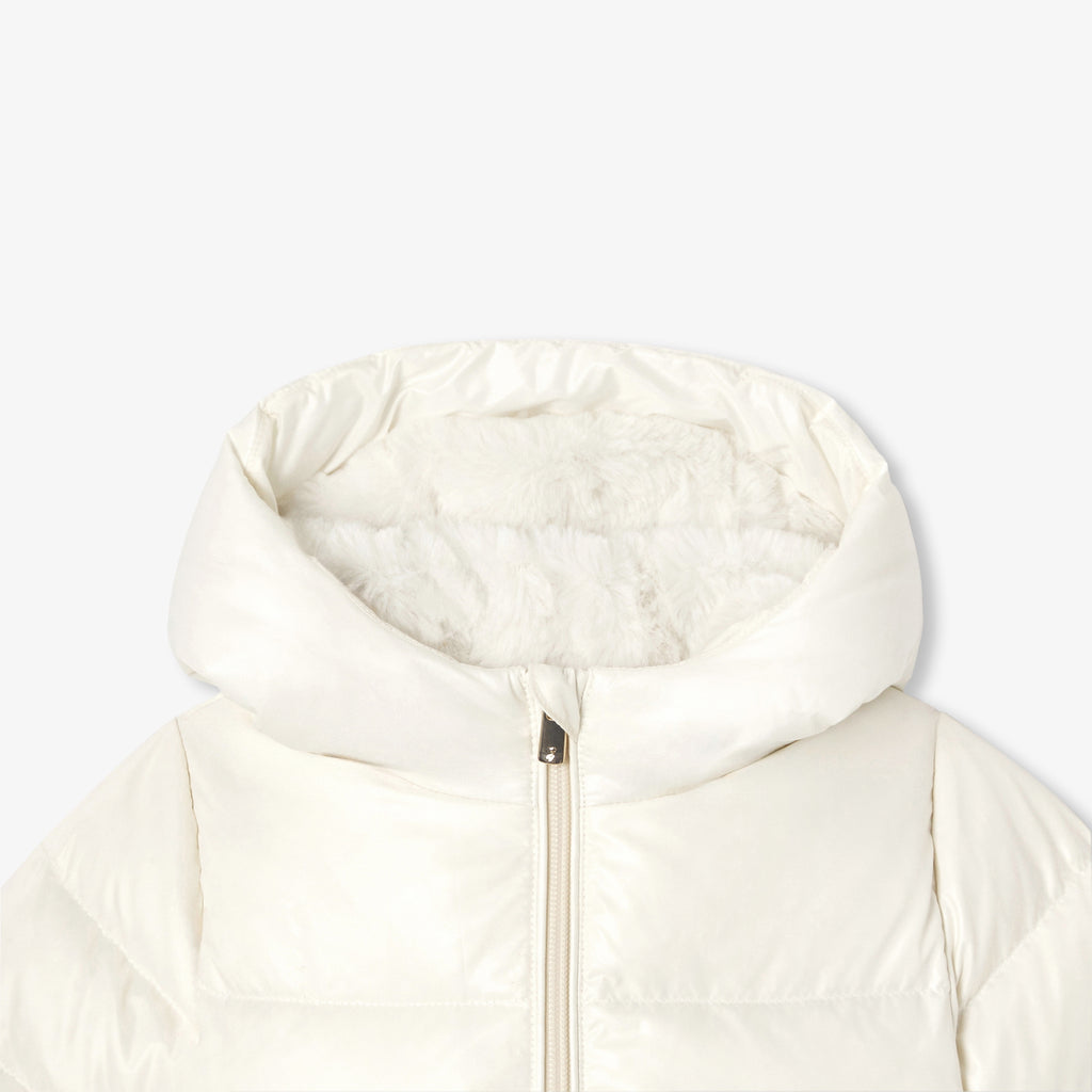 着心地の良さと現代的なエレガンスのバランスが魅力のダウンジャケット。やや細身のシルエットでヒップが隠れる丈感。中綿のフェザー、フードまで施したフェイクファーの裏地が暖かく包み込んでくれます。ゴールドのスナップボタンが付いたパッチポケットがアクセント。伸縮性のある袖口とファスナー開閉が実用的です。冬の日に最適なマストアイテム。