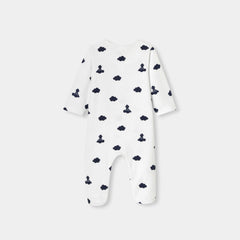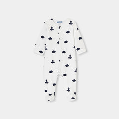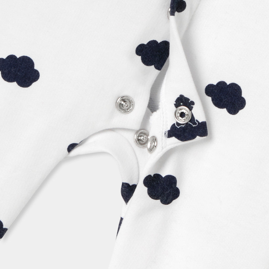 夢のような世界へと赤ちゃんを誘う、足つきロンパース・パジャマ。雲の上のテディベアのモチーフがキュートなデザインです。しなやかな起毛フリースの裏地付きで着心地が良く、正面のスナップボタンで開閉でき、着脱も簡単です。お昼寝時にも夜のおやすみタイムにも重宝しそう。