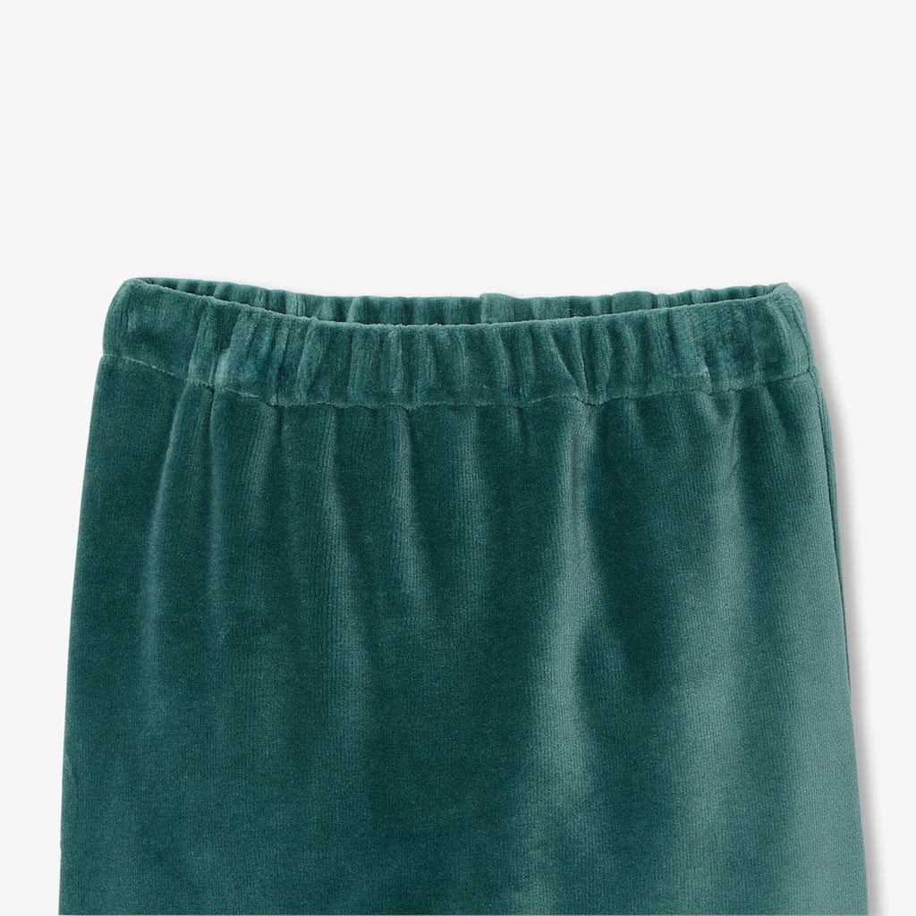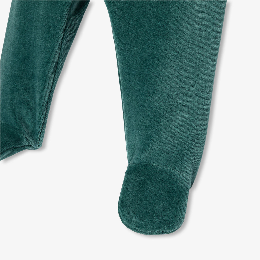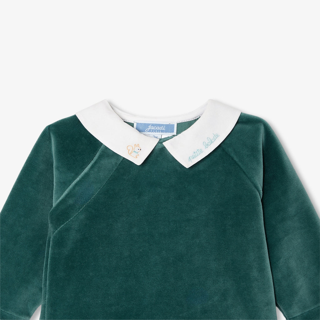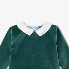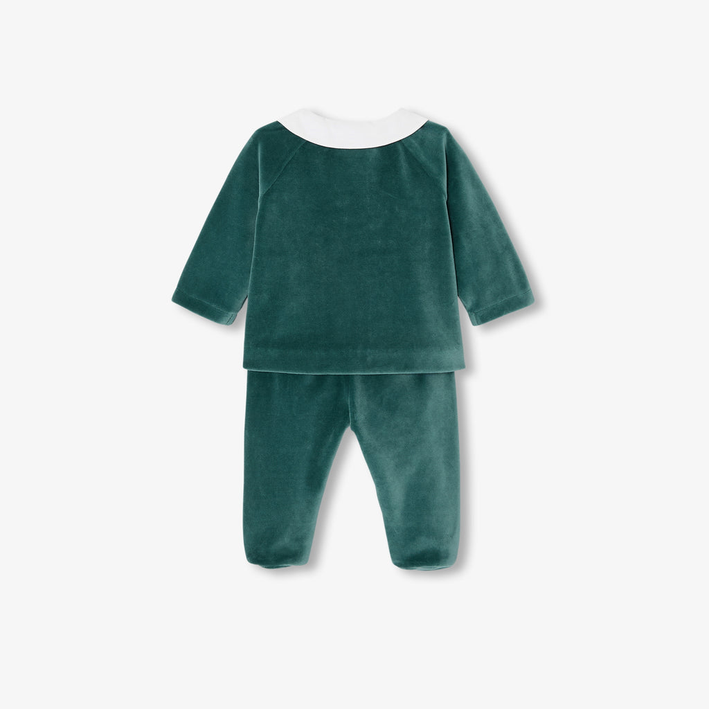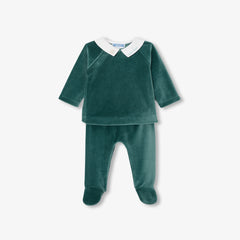 優しいグリーンのモダンなアンサンブル。柔らかくしなやかなベロア調生地で着心地が良く、手刺繍の襟付きトップスと足つきパンツが上下セットになっています。赤ちゃんをしっかりと温かく包み込む、秋らしさたっぷりのモデルです。