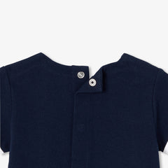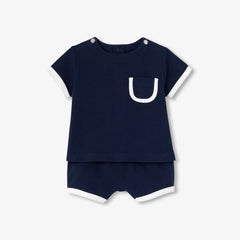マリンスタイルに着想を得たボートネックTシャツとホワイトのバイアス仕立てが、公園へのお散歩や海辺へのお出かけに映える一着です。
