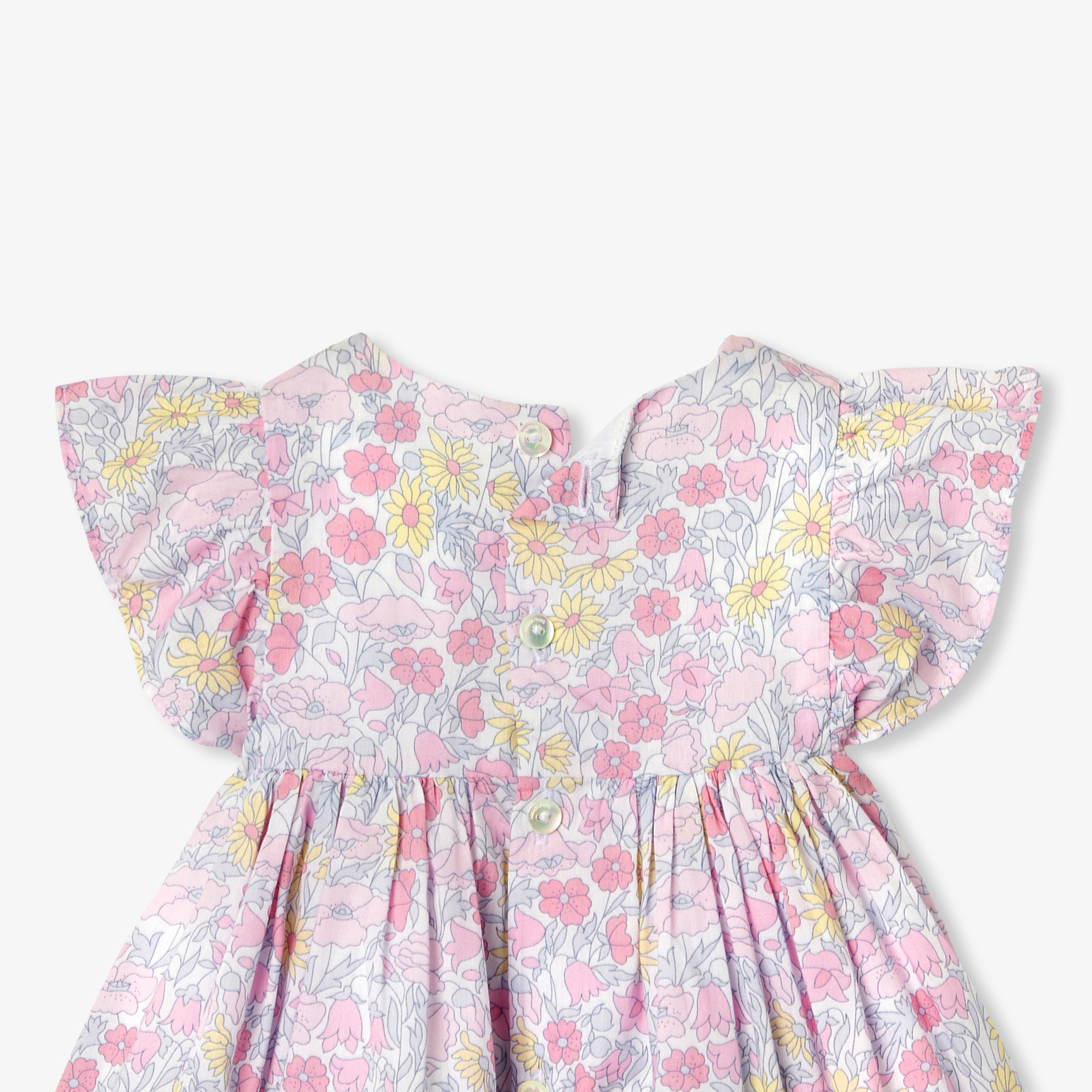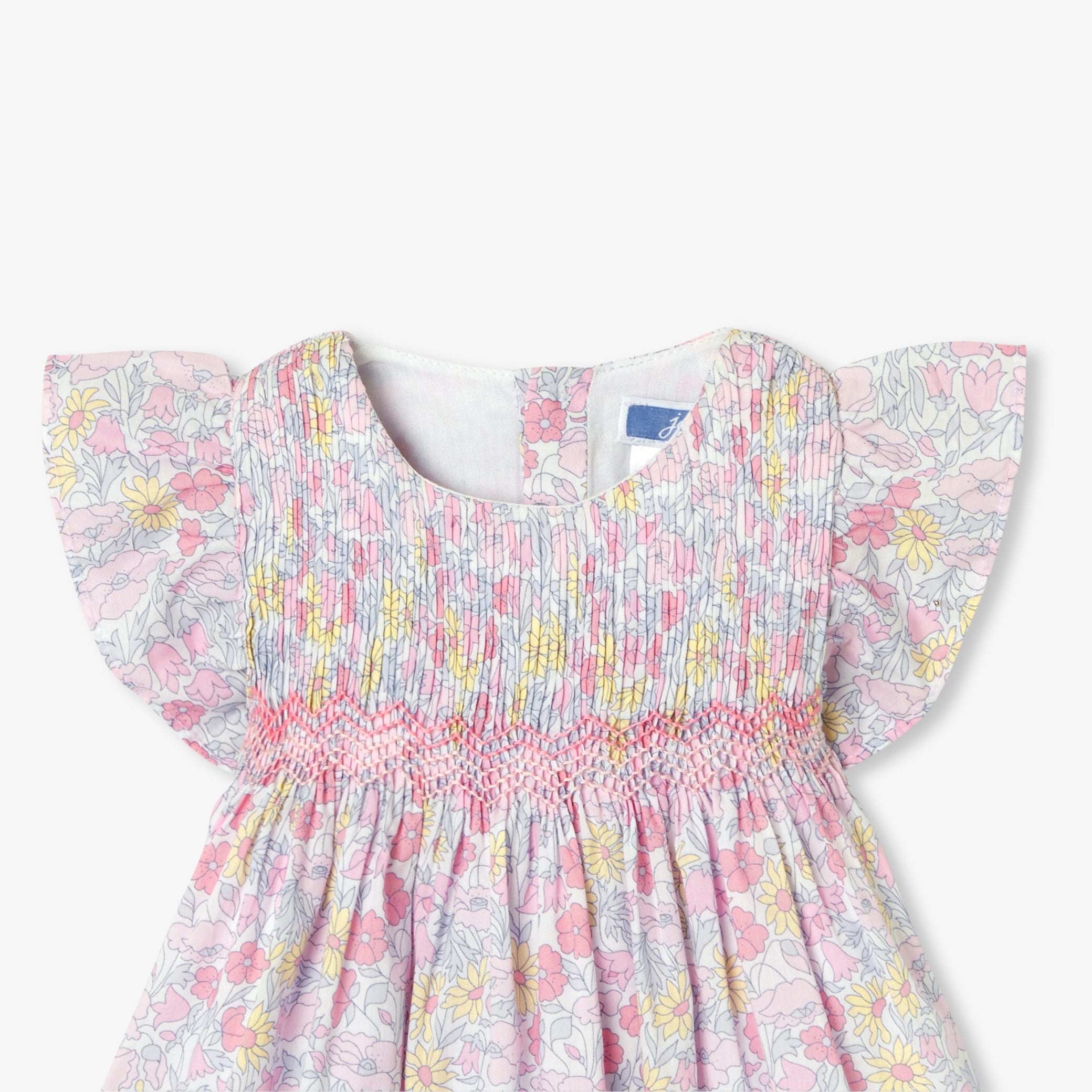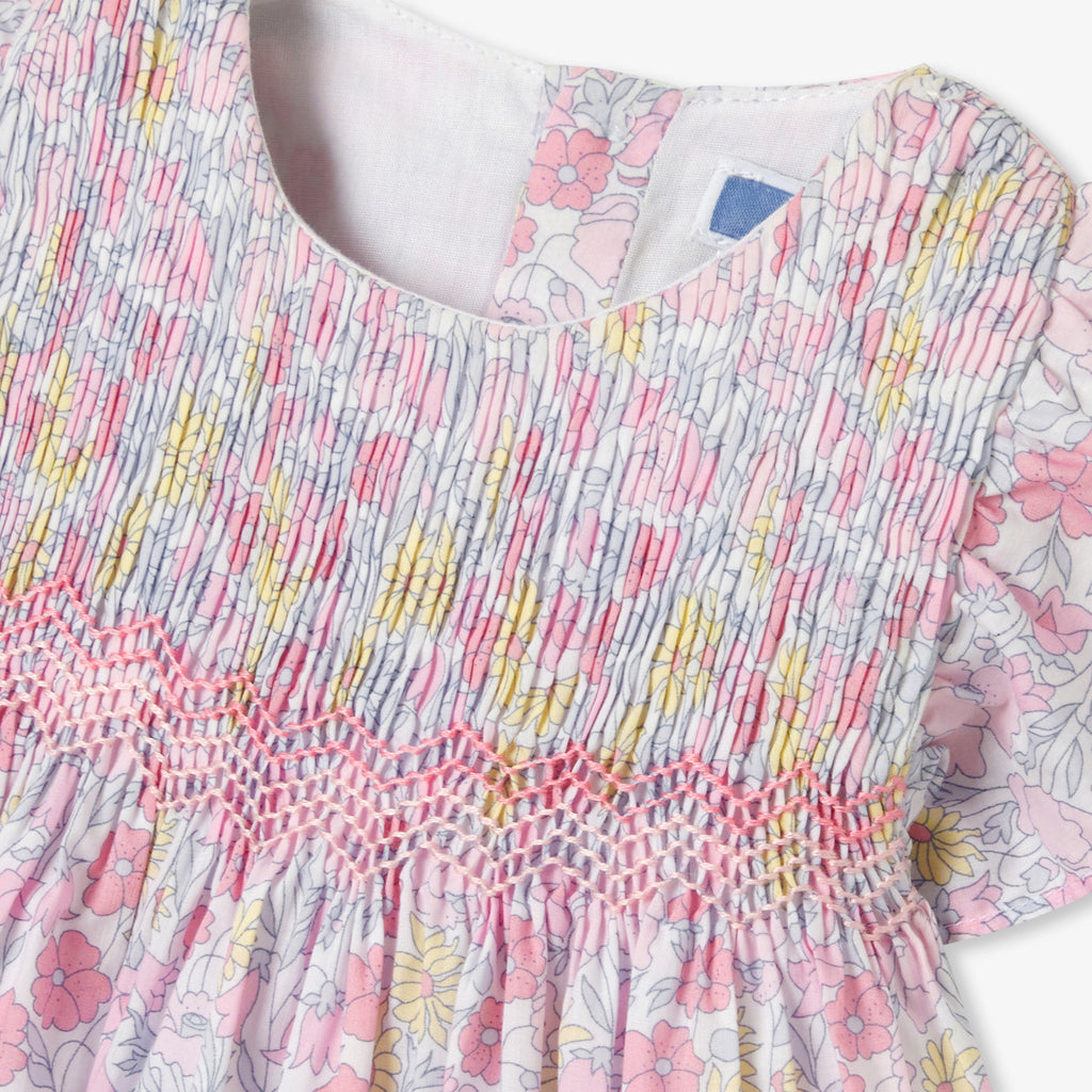 明るい季節の訪れとともに楽しみたい、リバティ生地のワンピースです。夏のワードローブに欠かせない一着。手作業のスモック刺しゅうと軽やかなフリルに、ジャカディらしいこだわりが感じられます。柔らかなポプリン裏地付きで、普段着にも特別な日の装いにもぴったりです。
