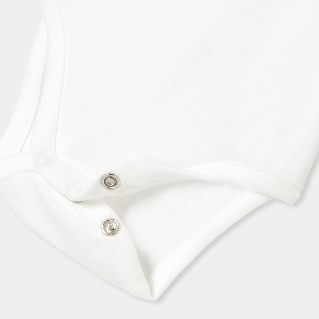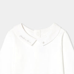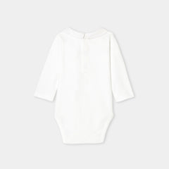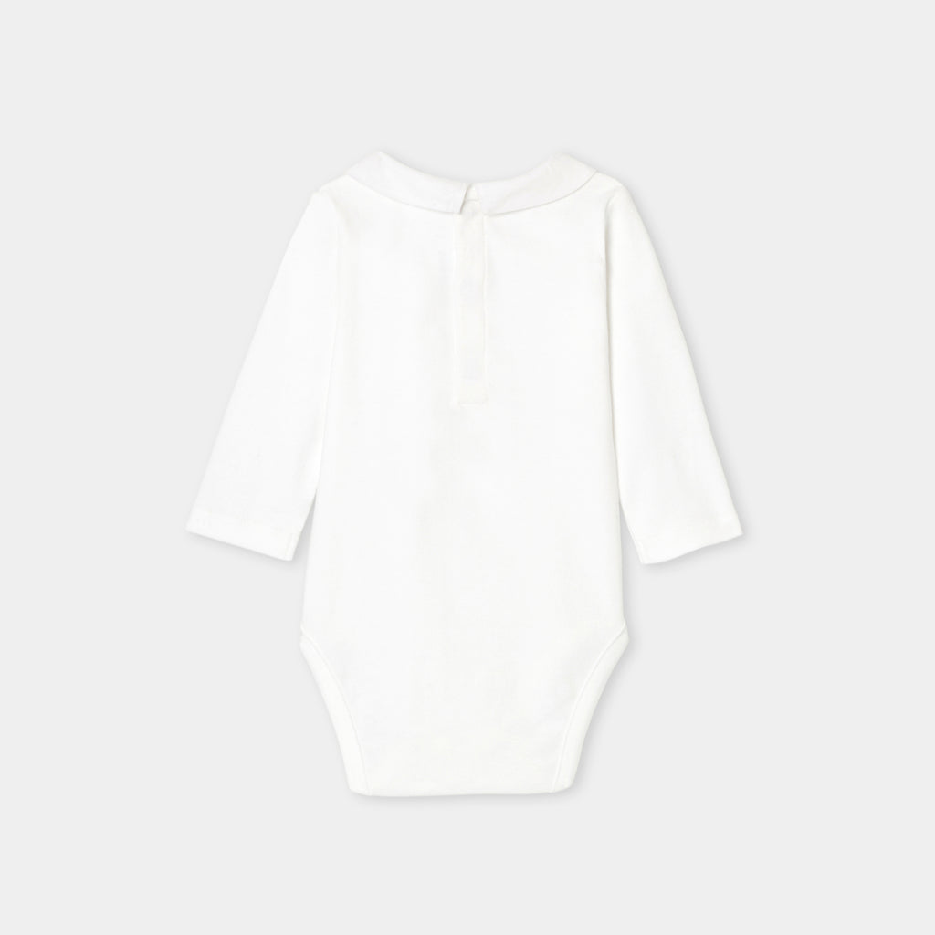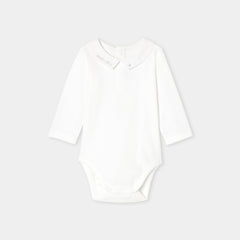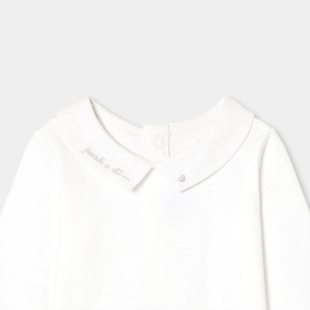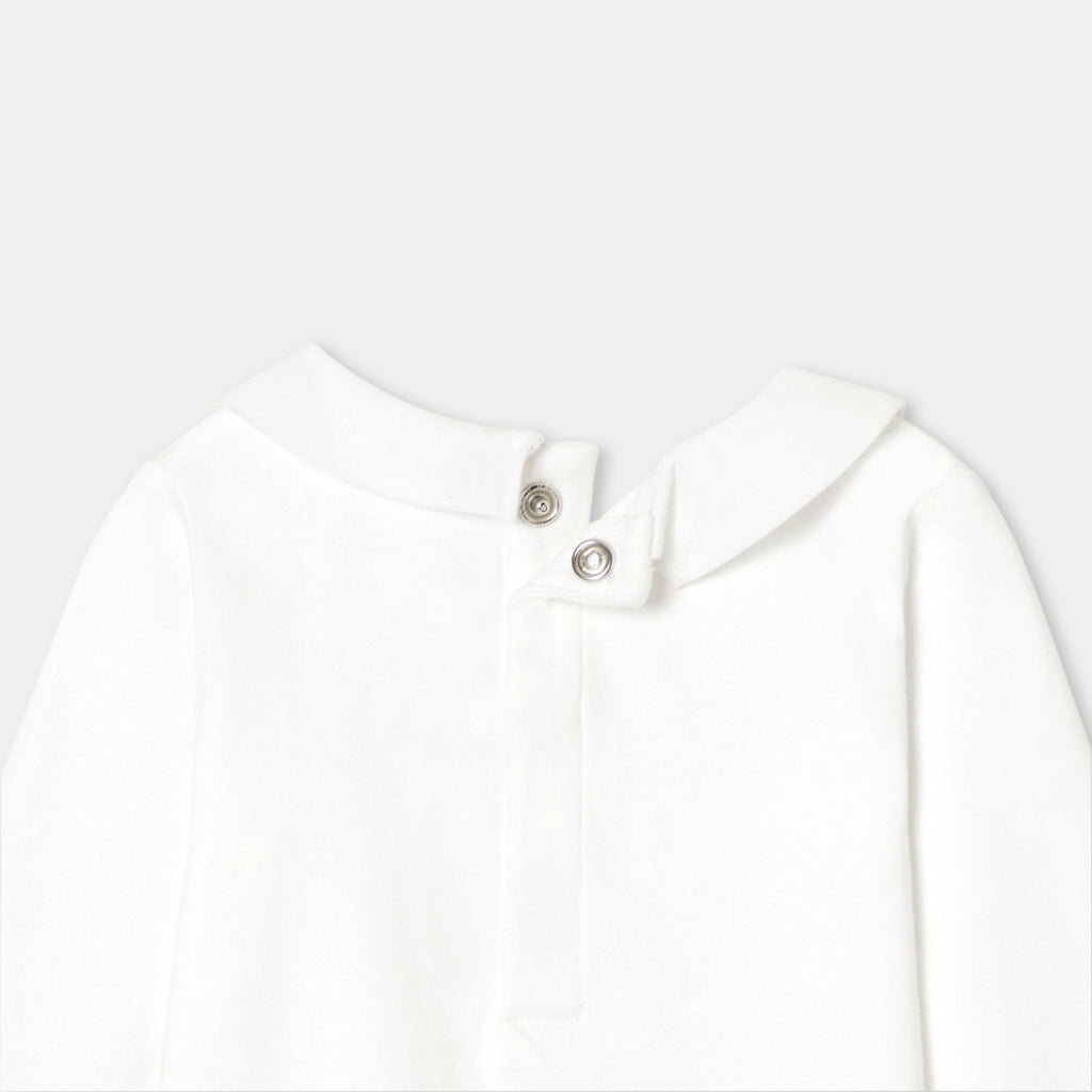 上品で万能な長袖ボディスーツ。柔らかで着心地の良いオーガニックコットンを使用したワードローブの必需品です。手刺しゅう入りの襟がアクセントになっており、秋の日のお出掛けにはロンパースやニットアンサンブルと合わせるのがおすすめ。