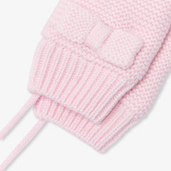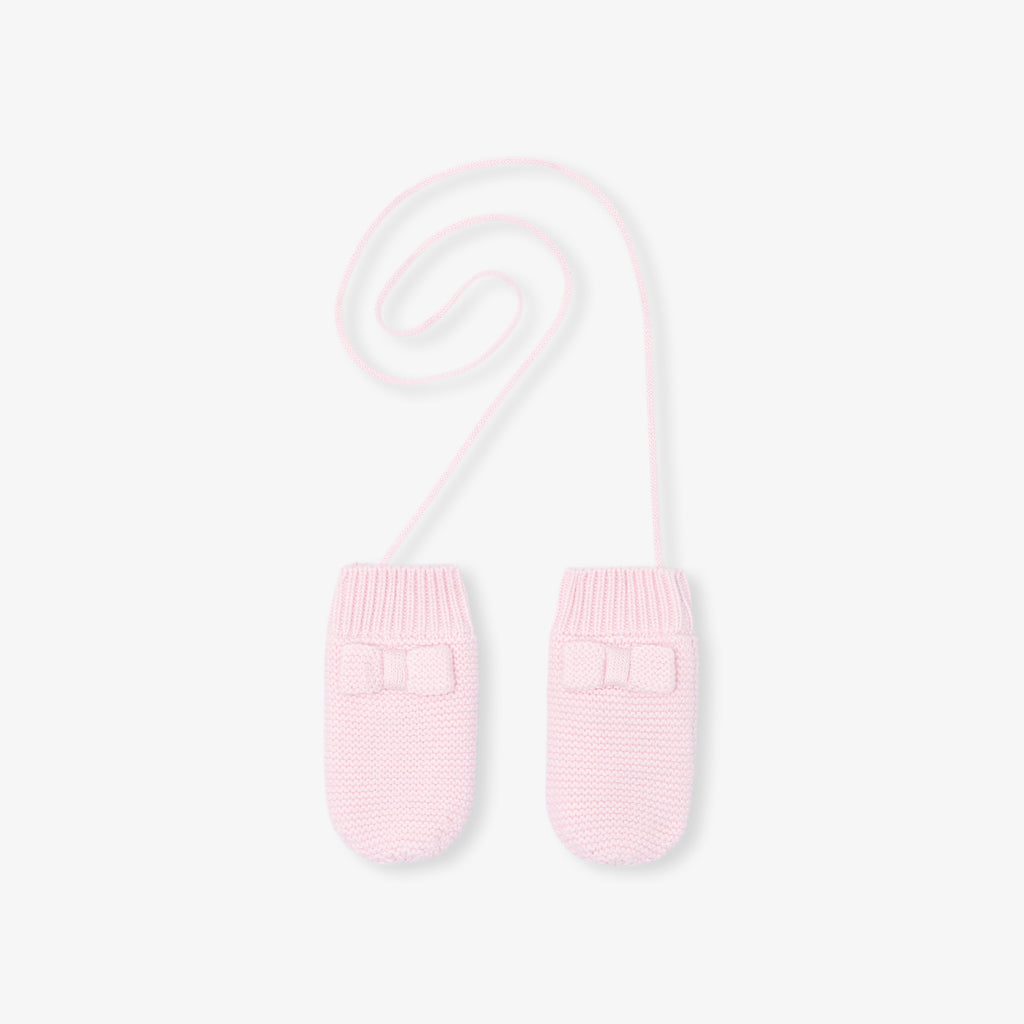 柔らかなコットンとカシミヤの、シックなミトン手袋。リボン飾りが可愛らしく、紐付きで、秋からのコートに合わせたいアイテムです。