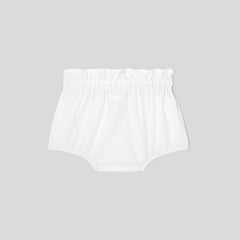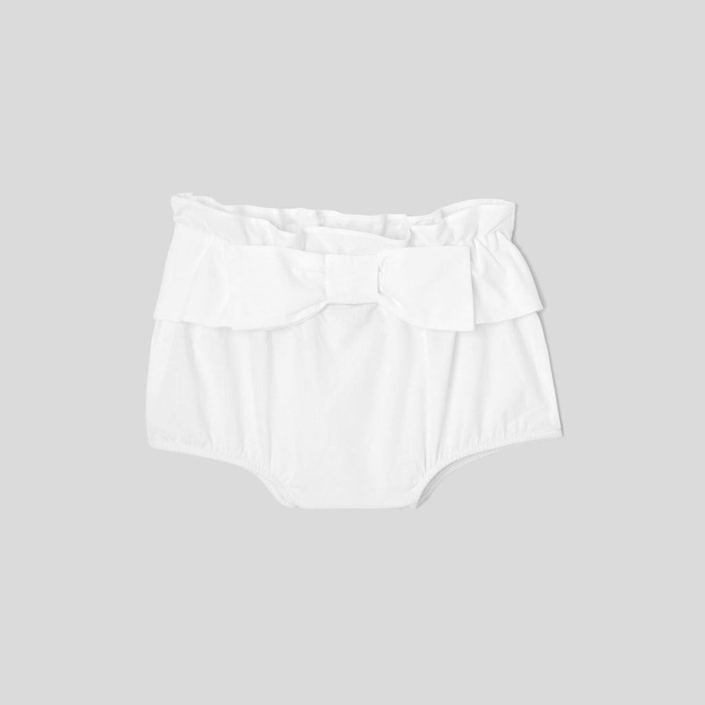 ウエストのリボン飾りが可愛らしいおむつカバー。ウエストゴムで履きやすく、柔らかく着心地の良いコットンを使用しています。ワンピースやサンダルと合わせてフォーマルルックに。