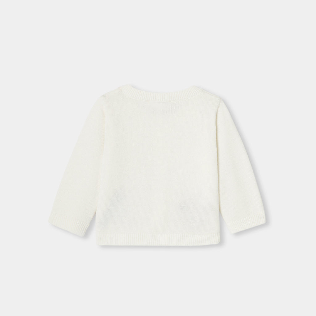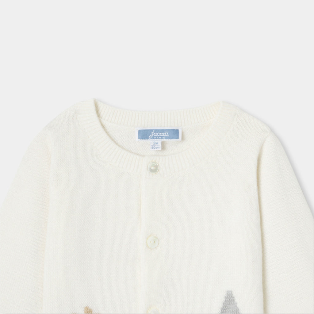クラシカルなカットとタイムレスな色合いのカーディガン。インターシャ織のエッフェル塔とリスのモチーフが可愛らしく、生地にはメリノウールとカシミヤを使用した、暖かで着心地の良いモデルです。冬にはベロア調生地のパンツやサロペットを合わせて。