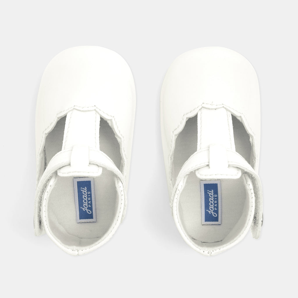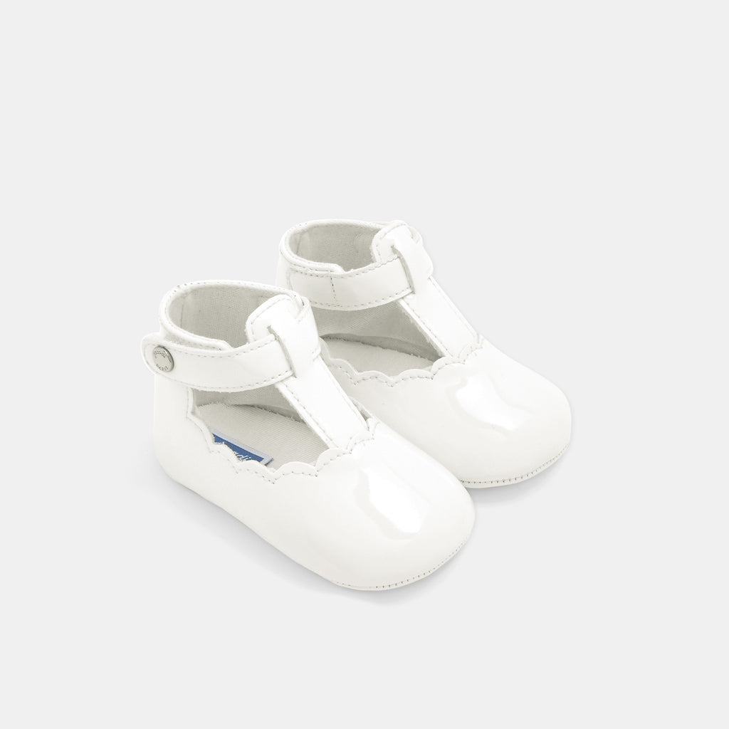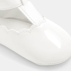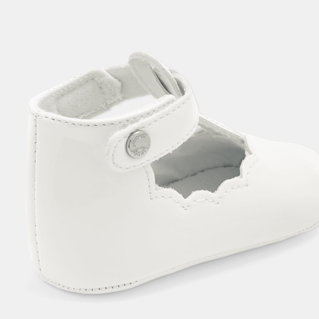 これからのあらゆるお呼ばれの席や、普段使いにもぴったり。エレガントなデザインのこの一足を、赤ちゃんへの初めてのシューズとして贈りませんか。上品なエナメル調の合成皮革を使用し、マジックテープ仕様のストラップで着脱も簡単。フリル付きの可愛い靴下とのコーディネートもおすすめです。