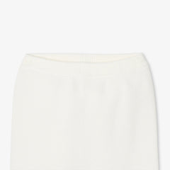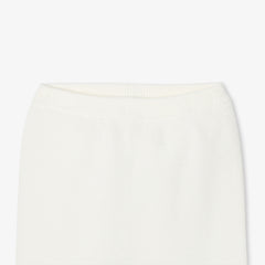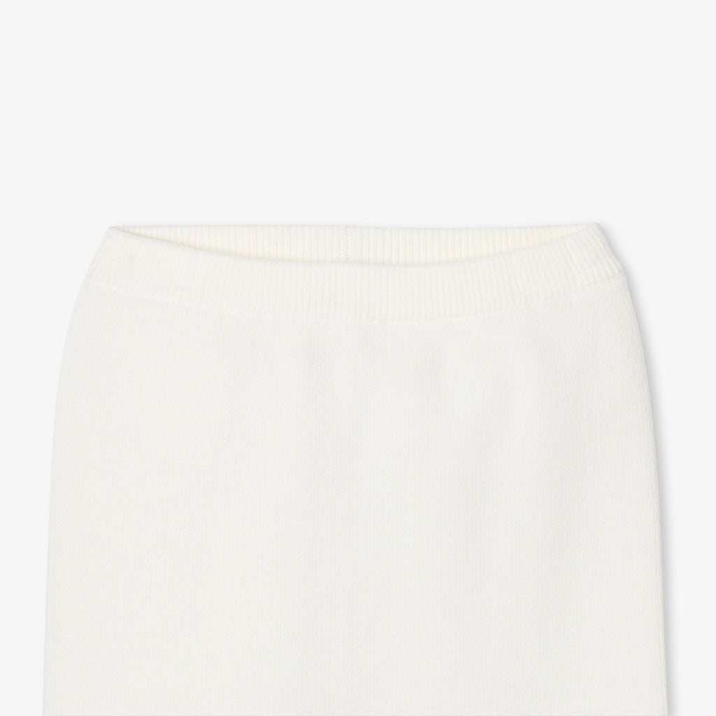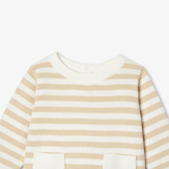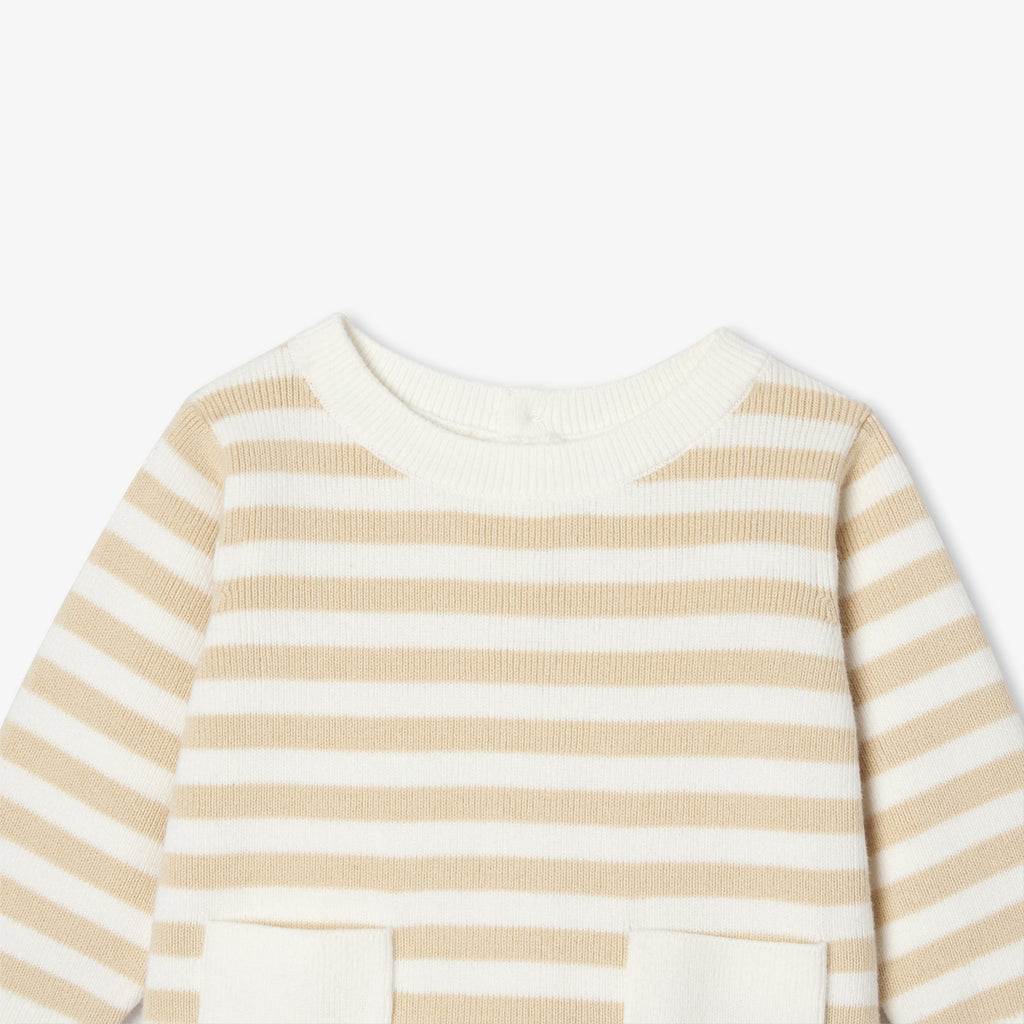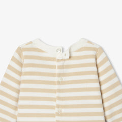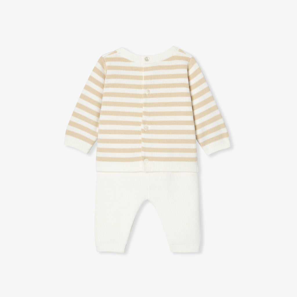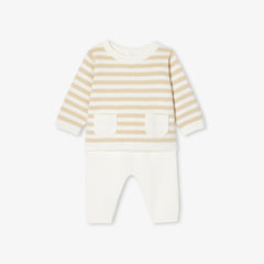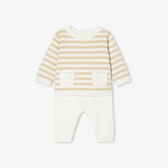 ボーダー柄が海辺を感じさせる、柔らかなオーガニックコットン製のニットアンサンブル。モダンで落ち着いた色合いが心地良く、背面のスナップボタンで開閉できるセーターと、伸縮性のあるウエストゴムのパンツが上下セットになっています。ボディスーツの上から簡単に着脱でき、デイリーユースや通園で活躍しそう。
