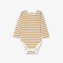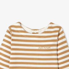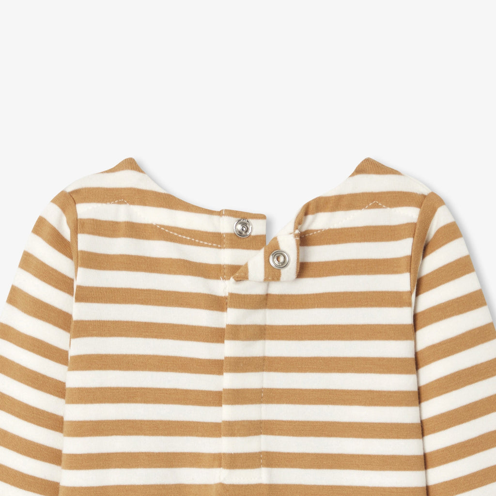 ラウンドネックのTシャツ風長袖ボディスーツ。季節にぴったりのキャラメル色のストライプと柔らかな着心地が特徴の今シーズンの必需品です。背面と股下のスナップボタンで開閉でき、着脱も簡単。ベロア調生地のサロペットとカシミヤのカーディガンを合わせて。