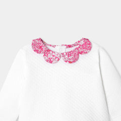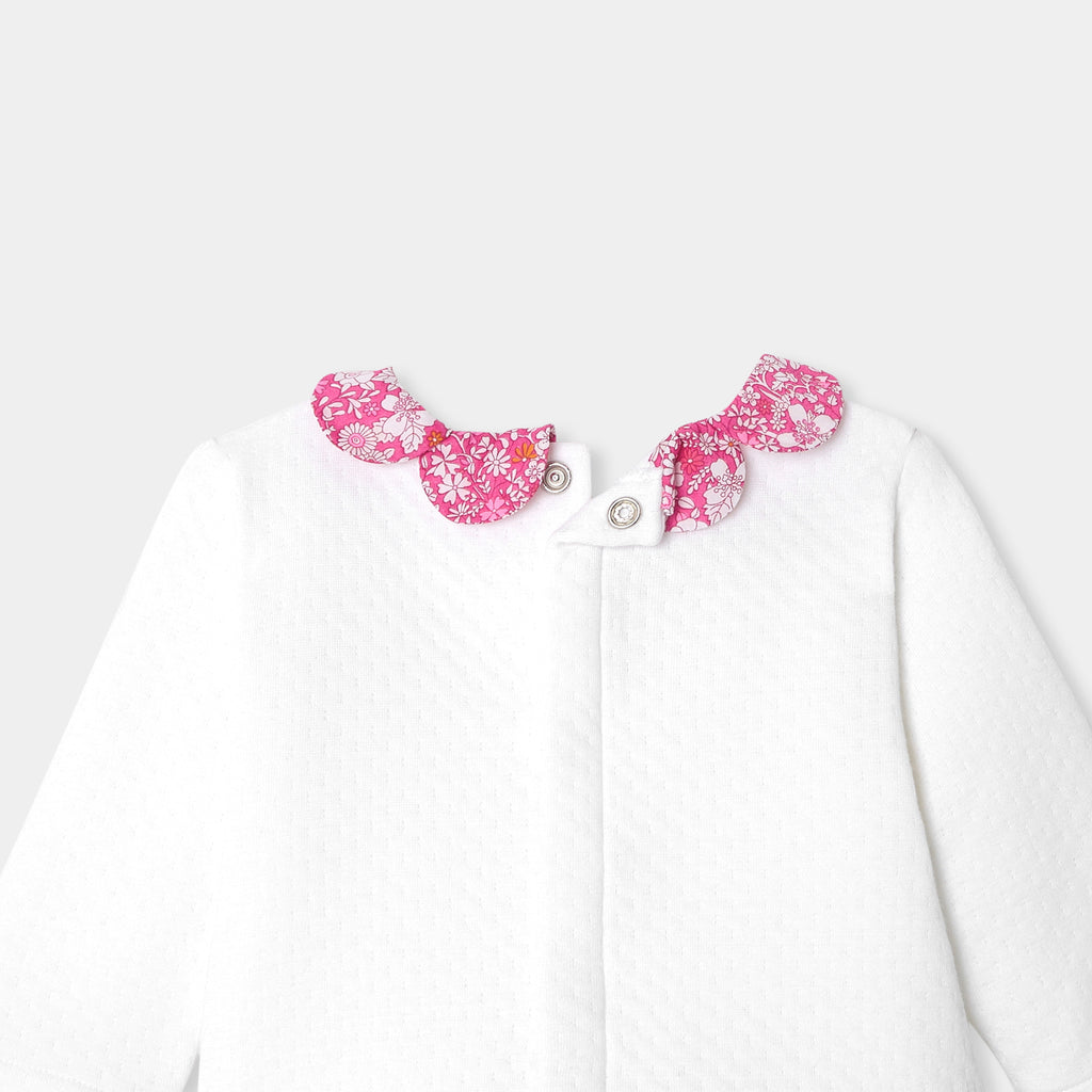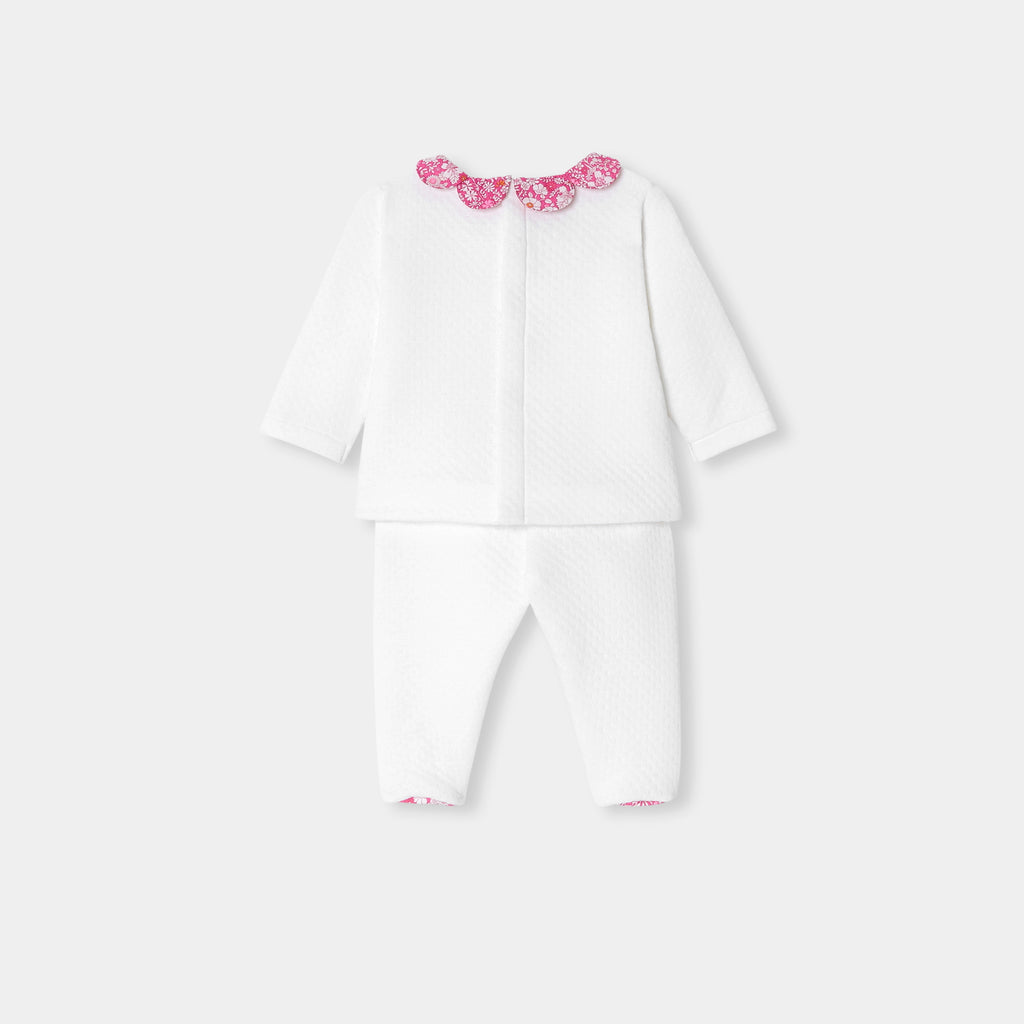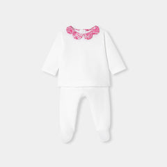 シックで万能なアンサンブル。着心地の良いコットンジャージー製で、背面のスナップボタンで開閉できるトップスと、着脱の簡単な伸縮性のあるウエストゴム入りパンツがセットになっています。ペタルカラー(襟)と足元のリバティプリント(花柄)が可愛らしく、ゆったりとしたフィット感がポイントに。毎日の装いをおしゃれに演出してくれるアイテムです。