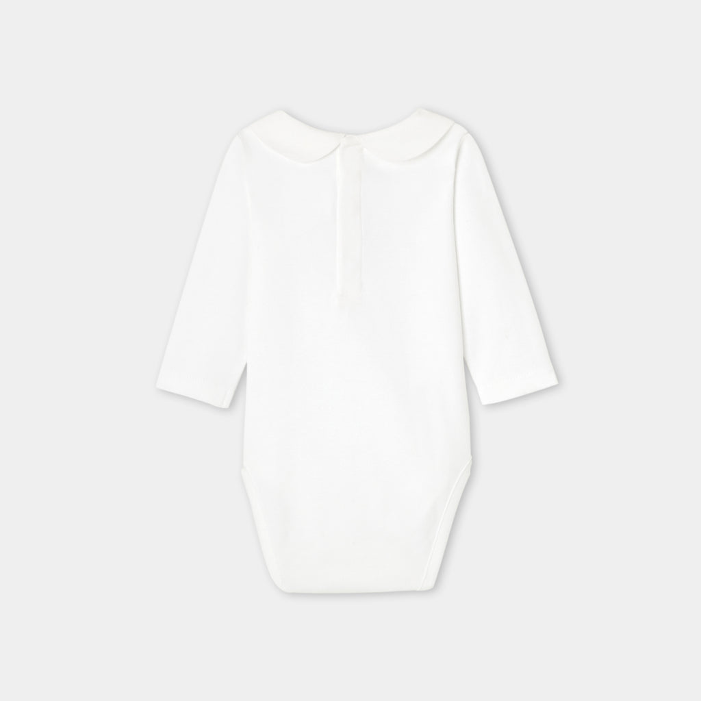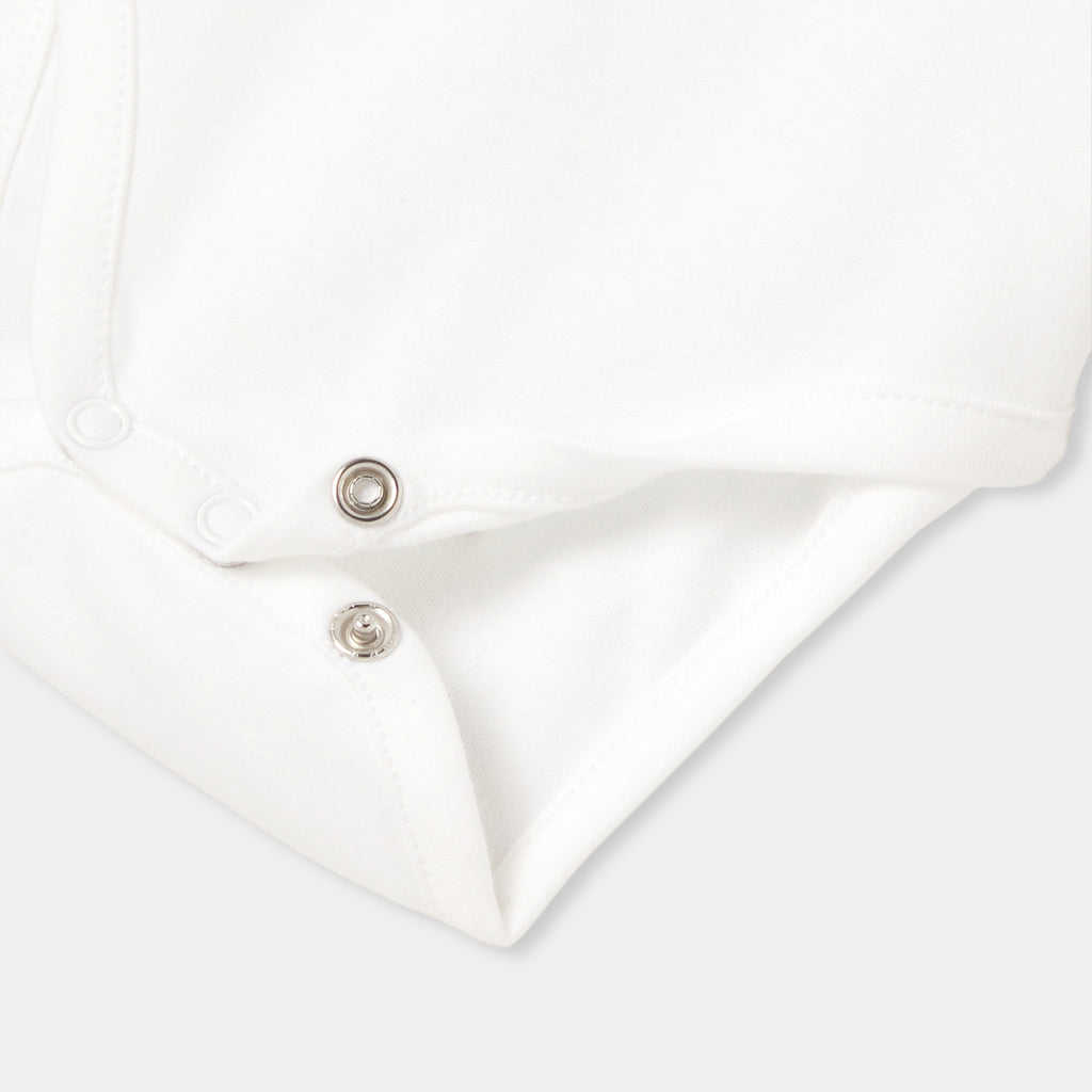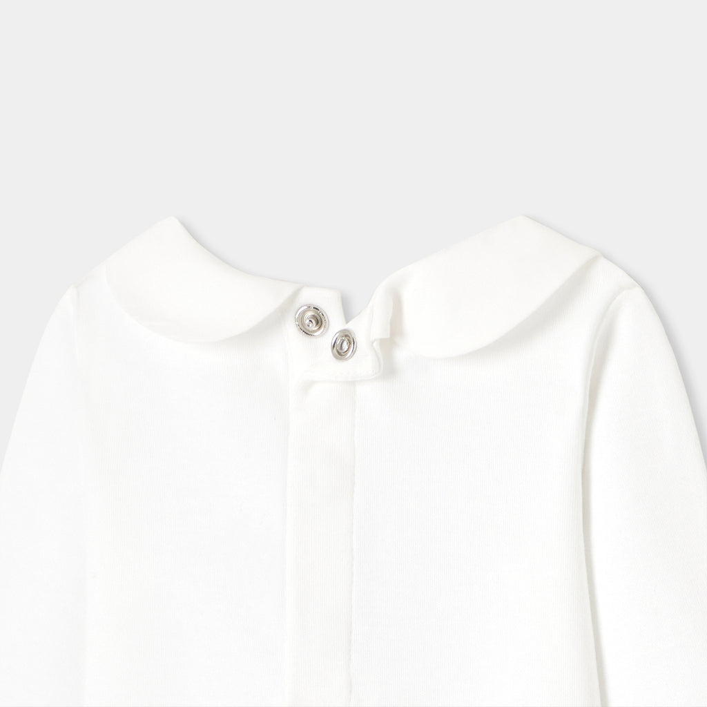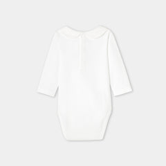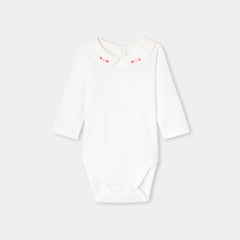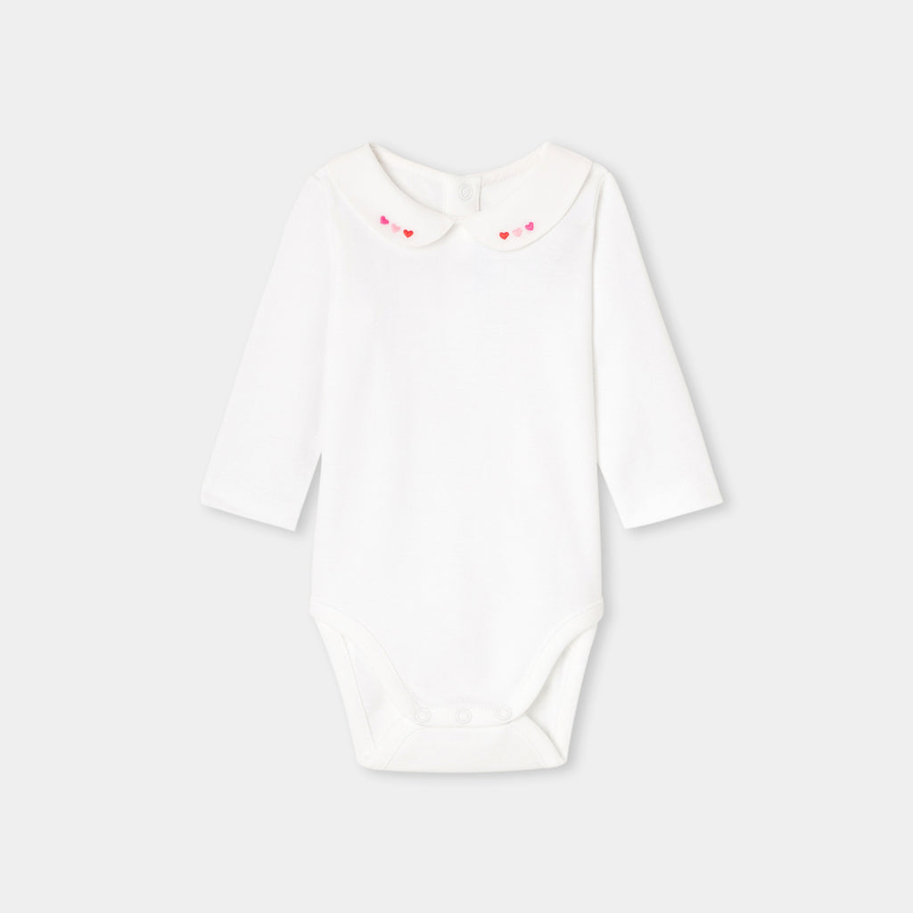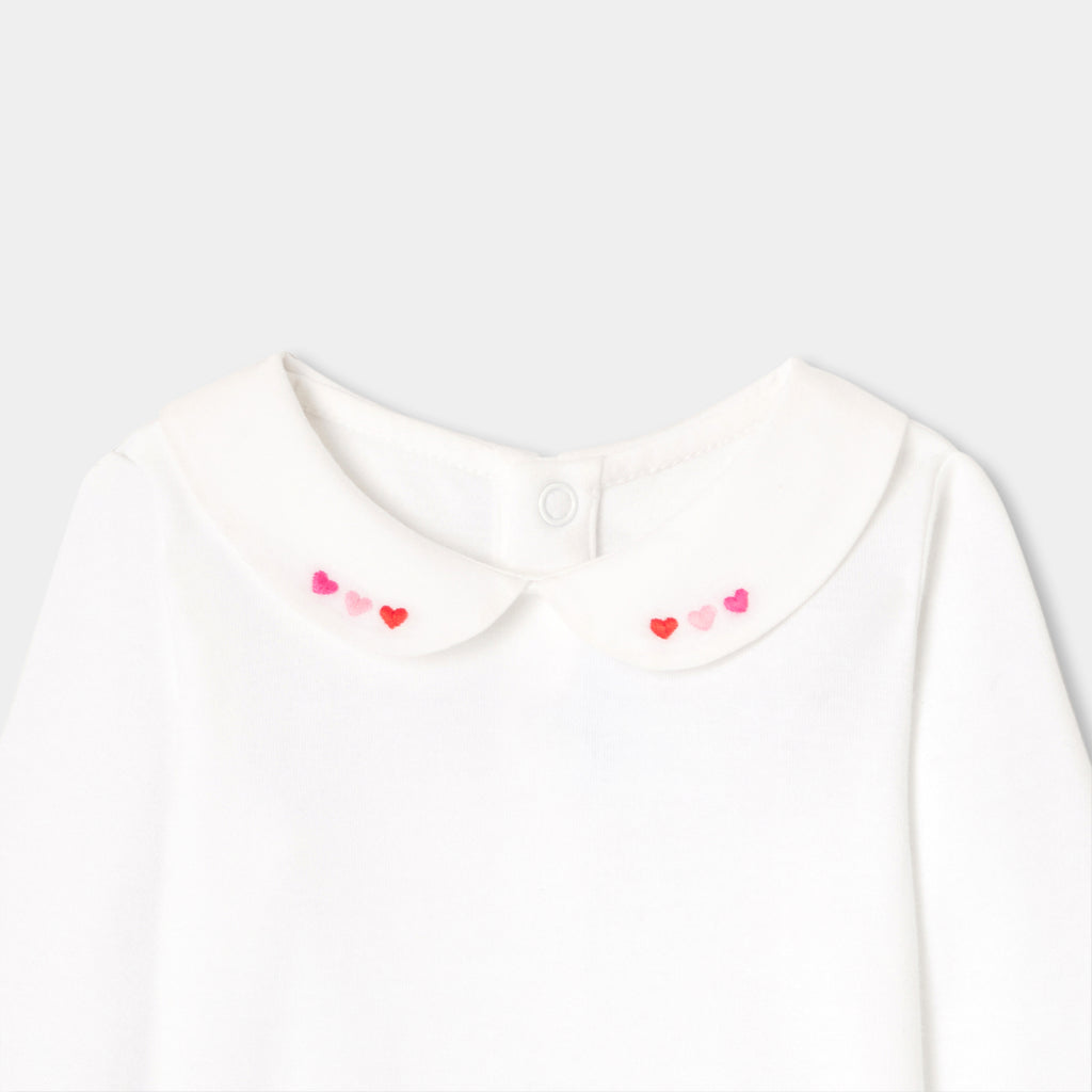 小さなハートの刺しゅうが目を惹く、クラシカルな長袖ボディスーツが新登場。柔らかでしなやかなコットンを使用しており、背面と股下のスナップボタン開閉で着脱も簡単。ハート柄のロンパースを合わせれば、可愛らしさあふれるルックの完成です。