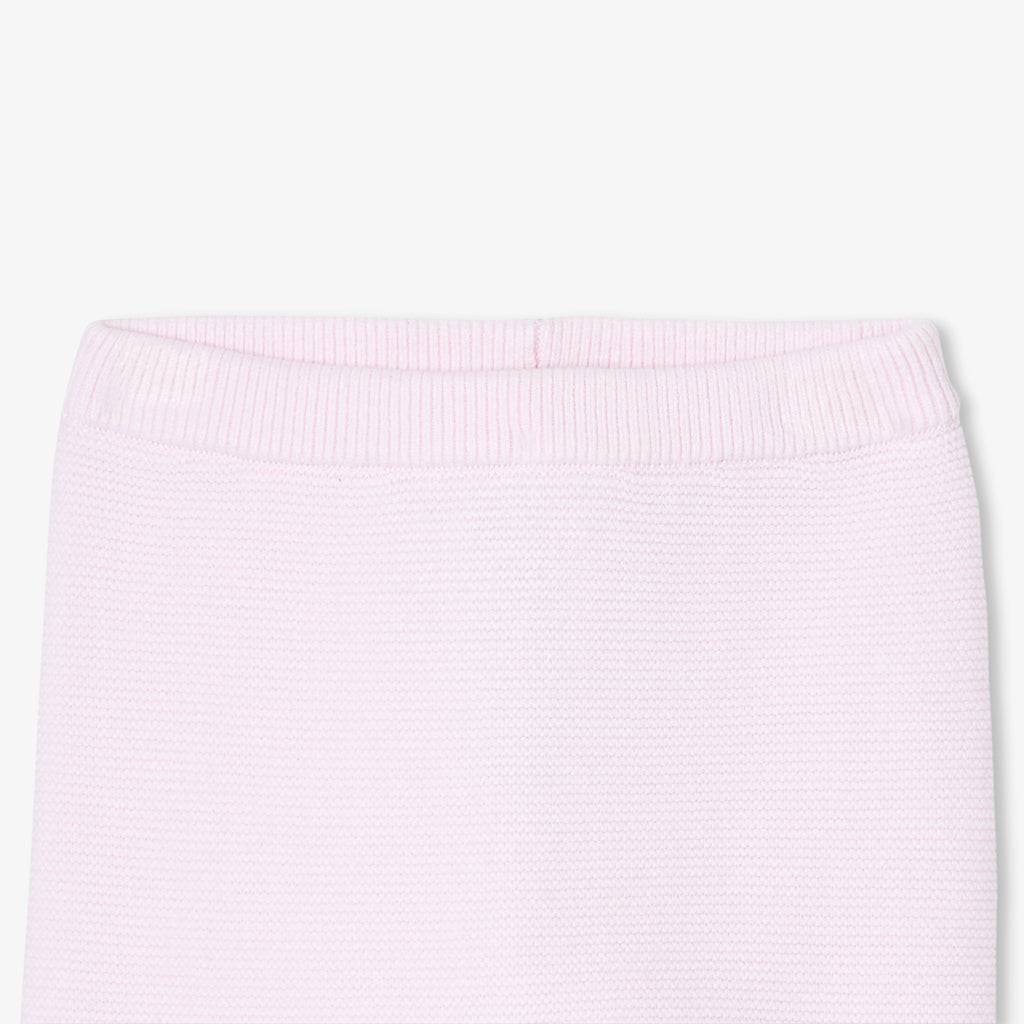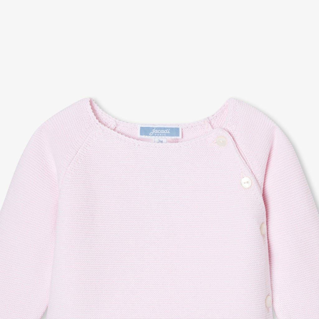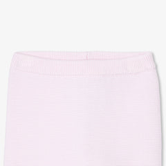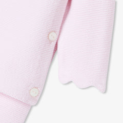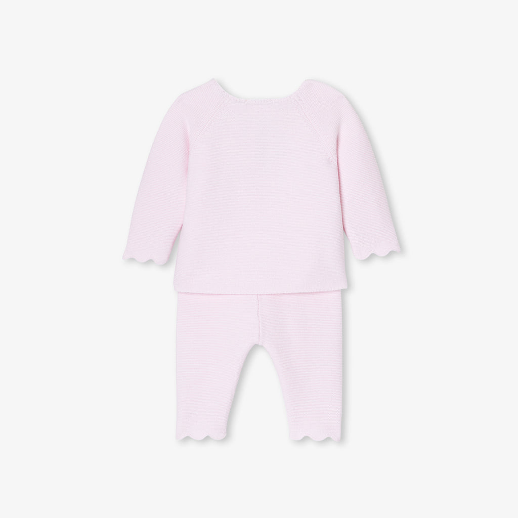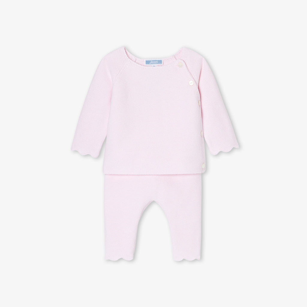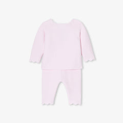 エレガンスと快適性を兼ね備えた、ガーター編みのシックな正統派ニットアンサンブル。オーガニックコットンを使用した柔らかな着心地で、生まれたばかりの赤ちゃんを優しく守ります。正面のボタンで開閉できるトップスと、着脱の簡単な伸縮性のあるウエストゴム入りパンツが上下セットになっており、スカラップのディテールがキュートな雰囲気を演出しています。ご自宅用やギフト、ファーストセットにもおすすめです。