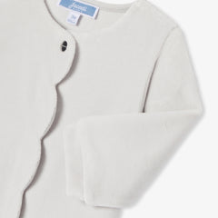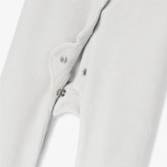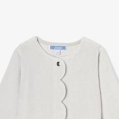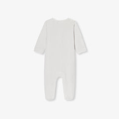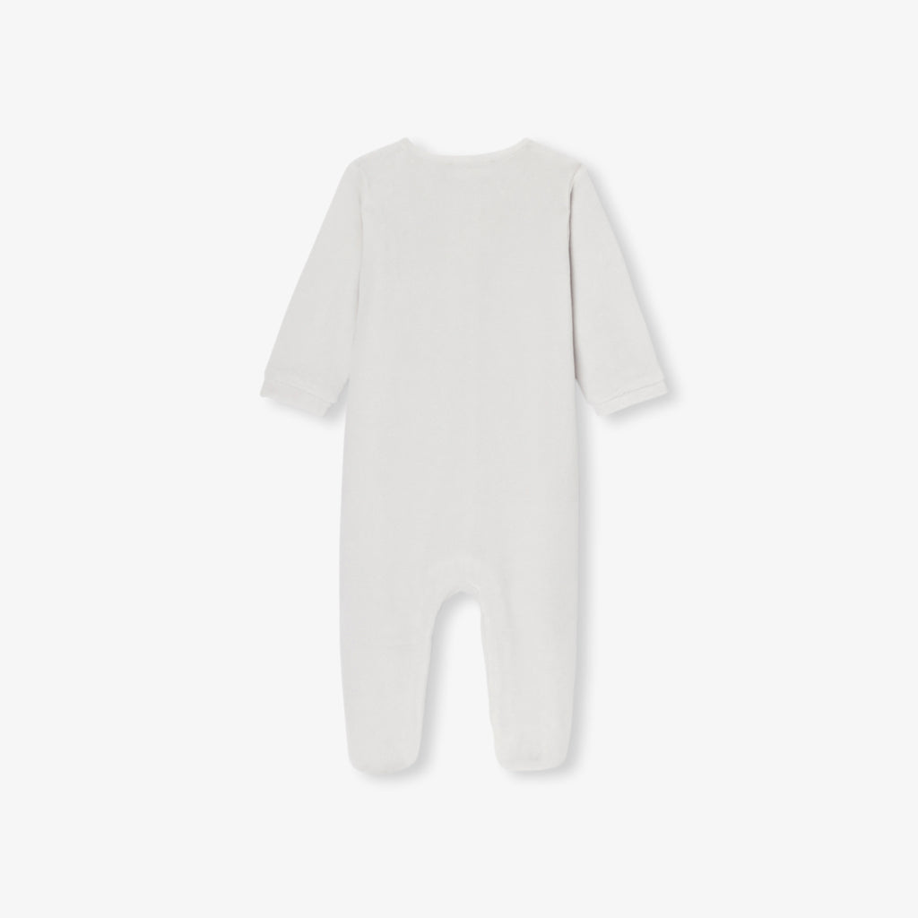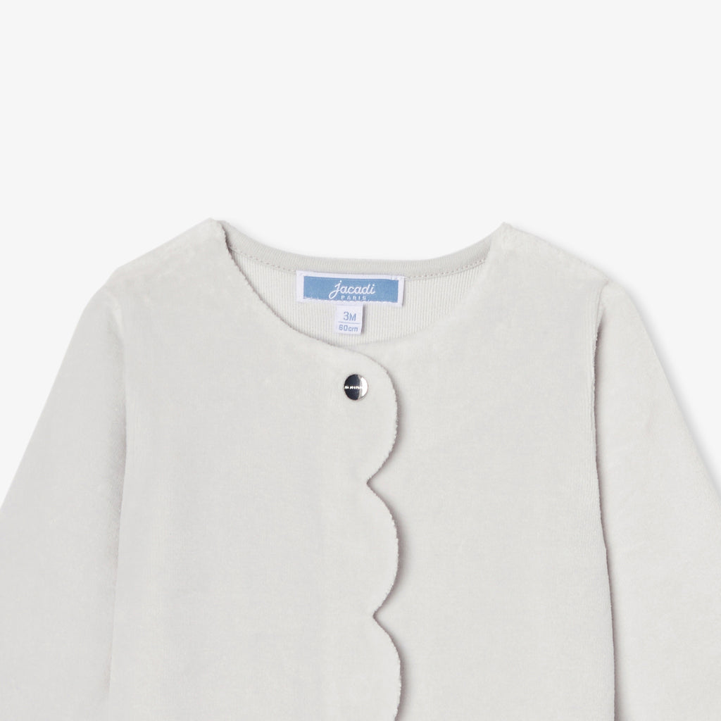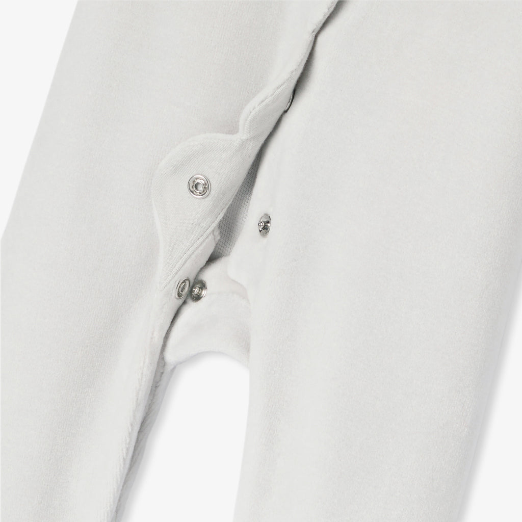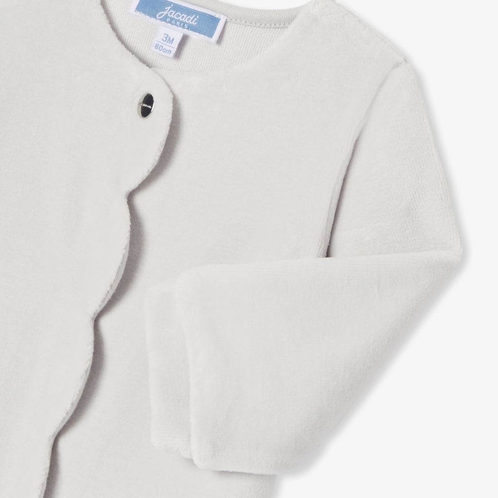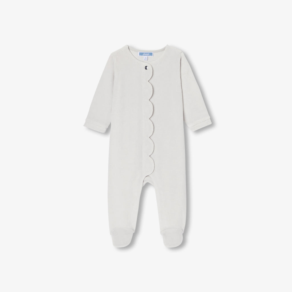 生まれたばかりの赤ちゃんを快適に包み込む、ベロア調生地の足つきロンパース・パジャマ。スカラップのあしらいがキュートなジャカディらしいデザインで、ご出産後からすぐにお使いいただけます。正面と股下のスナップボタンで開閉でき、着脱も簡単。素敵な夢を約束してくれる一着です。