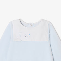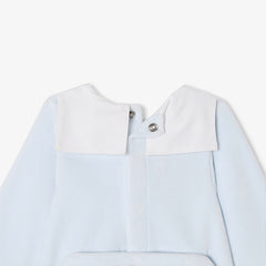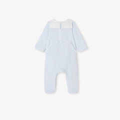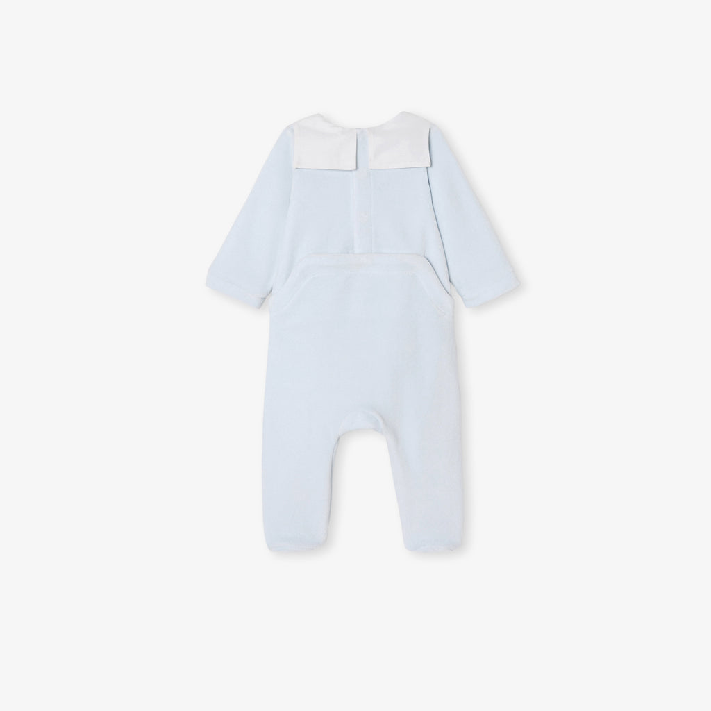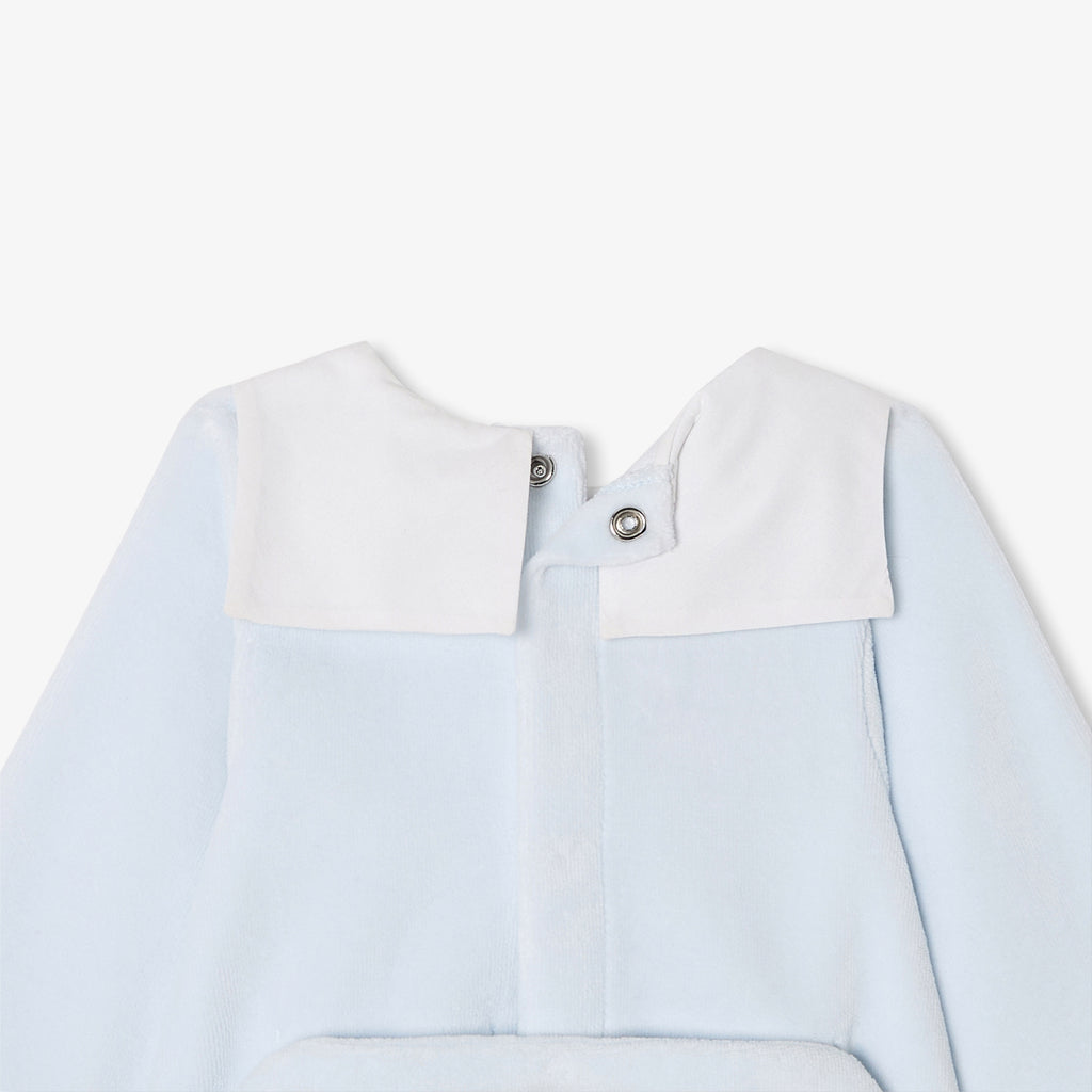 ファーストセットに加えたくなる、シックな雰囲気の足つきロンパース・パジャマ。柔らかで暖かみのあるベロア調生地を使用しており、ポプリンのセーラーカラー(襟)がエレガントなスタイルを演出。背面のスナップボタンで開閉できる、着脱の簡単な実用性の高いモデルとなっています。小さなテディベアの手刺しゅう入りで、ご自宅用にもギフトにもおすすめ。
