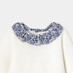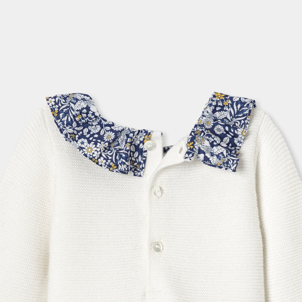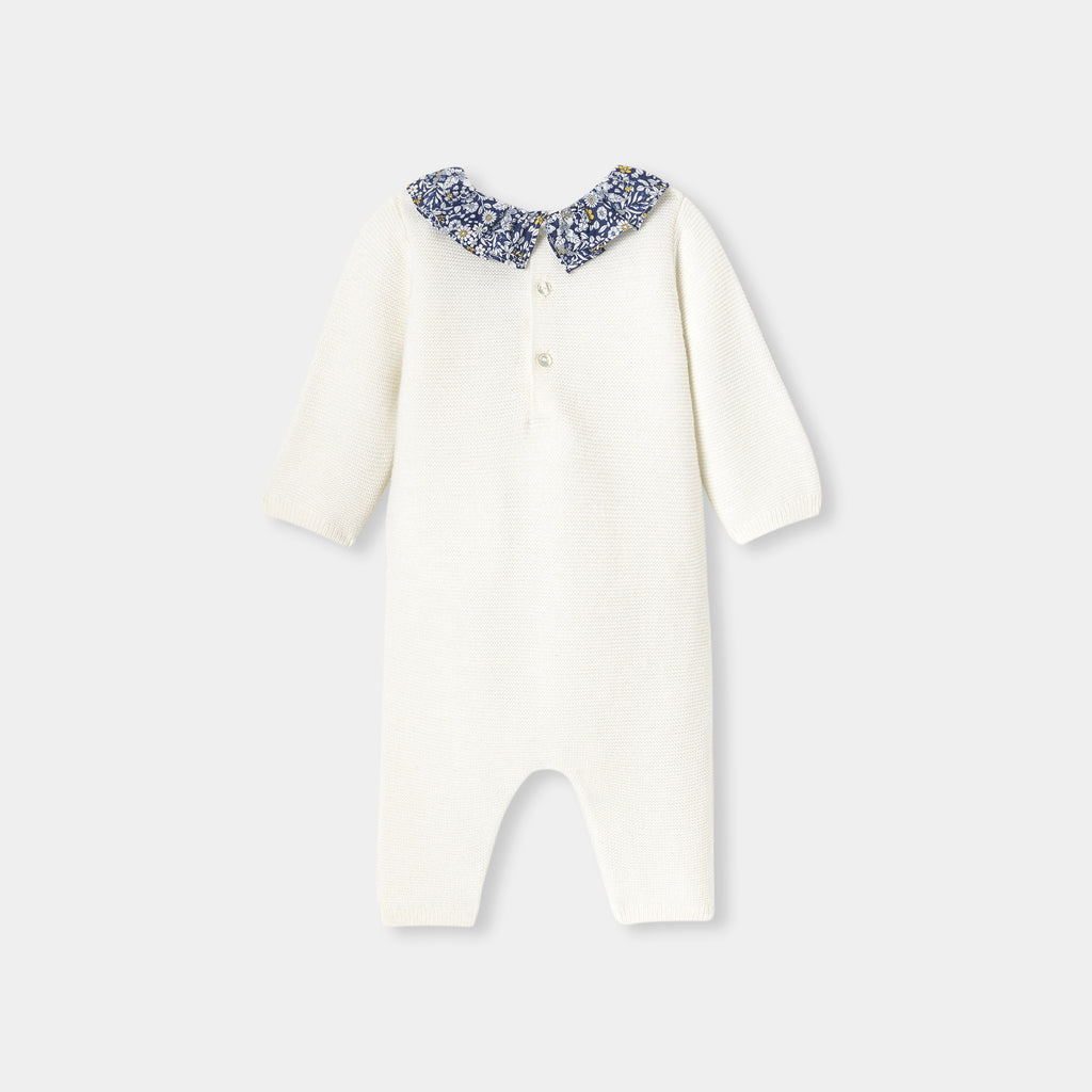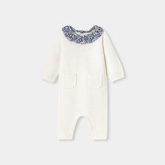 ジャカディの技術がぎゅっと詰まった正統派ロンパース。シックで着心地の良い、この冬のデイリーユースにぴったりの一着です。ウールとカシミヤを使用した暖かなモデルで、リバティプリント(花柄)の襟とパッチポケットがポイントに。背面のボタンと目立ちにくい股下のスナップボタンで、着脱も簡単。ご家族で長く愛用いただけます。