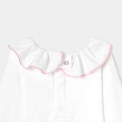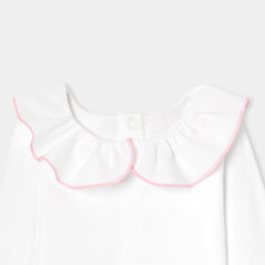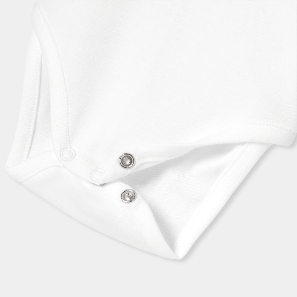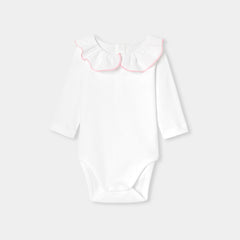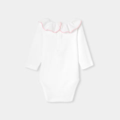 赤ちゃんの装いを引き立てる、シックで印象的なデザインの長袖ボディスーツ。幅広のフリルが可愛らしく、生地には柔らかでしなやかなオーガニックコットンを使用しています。背面と股下のスナップボタンで開閉でき、デニムワンピースやロンパースと合わせれば、パリシックなシルエットに。