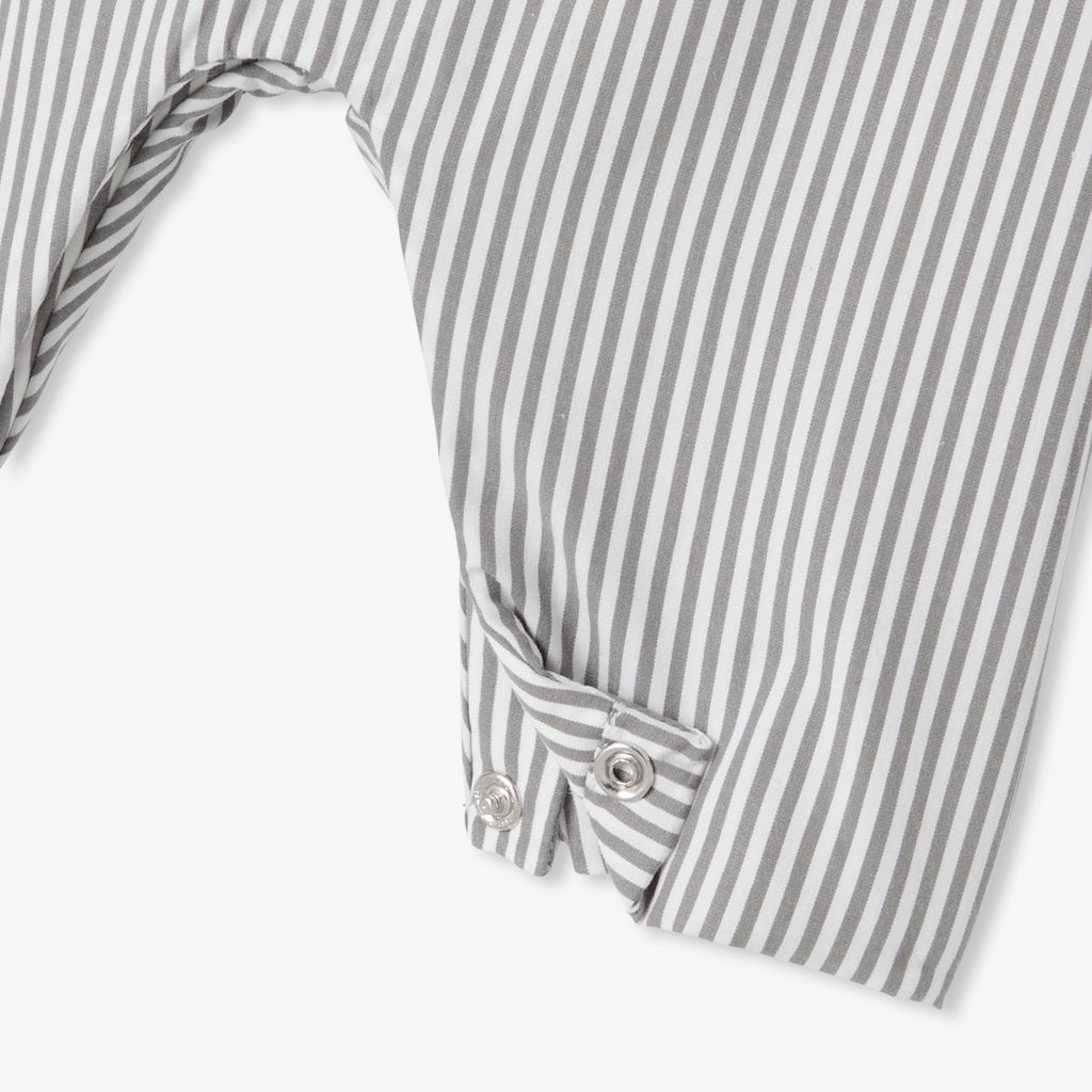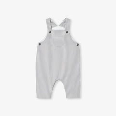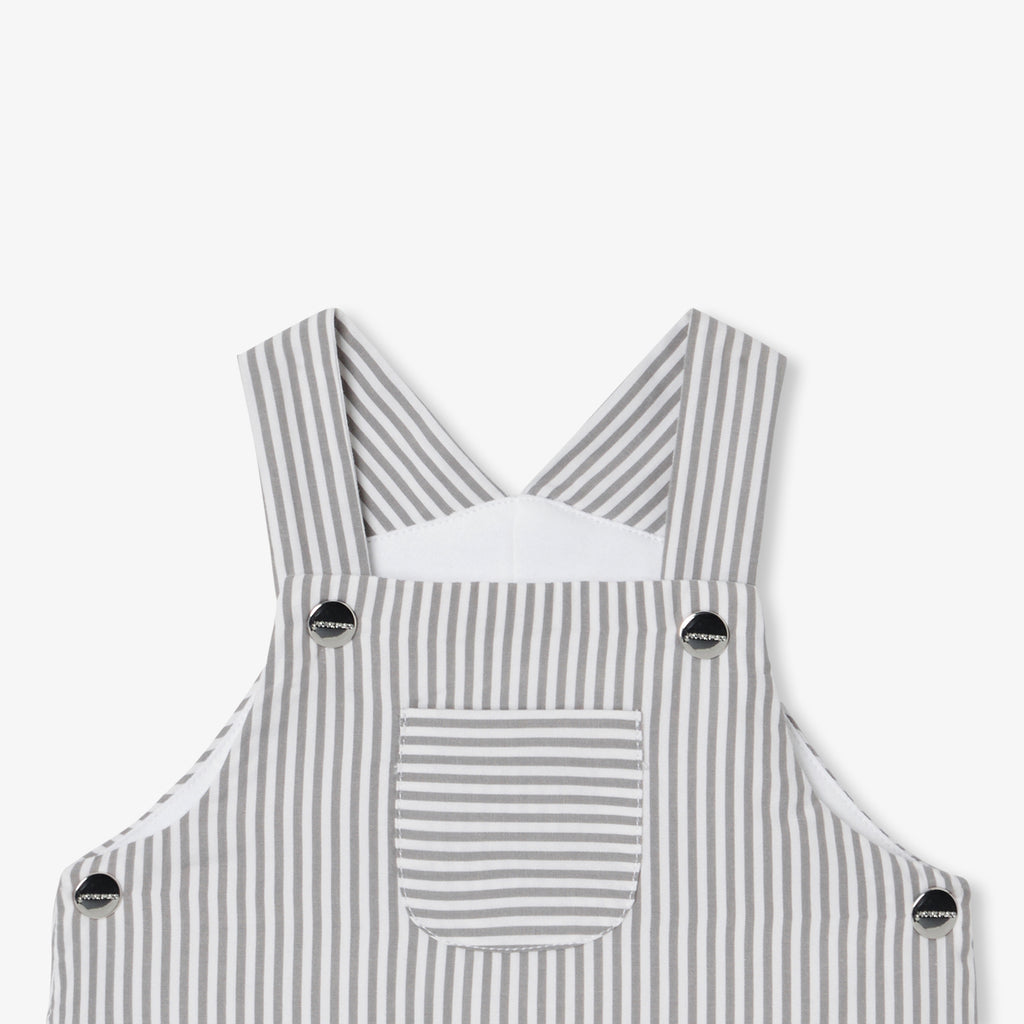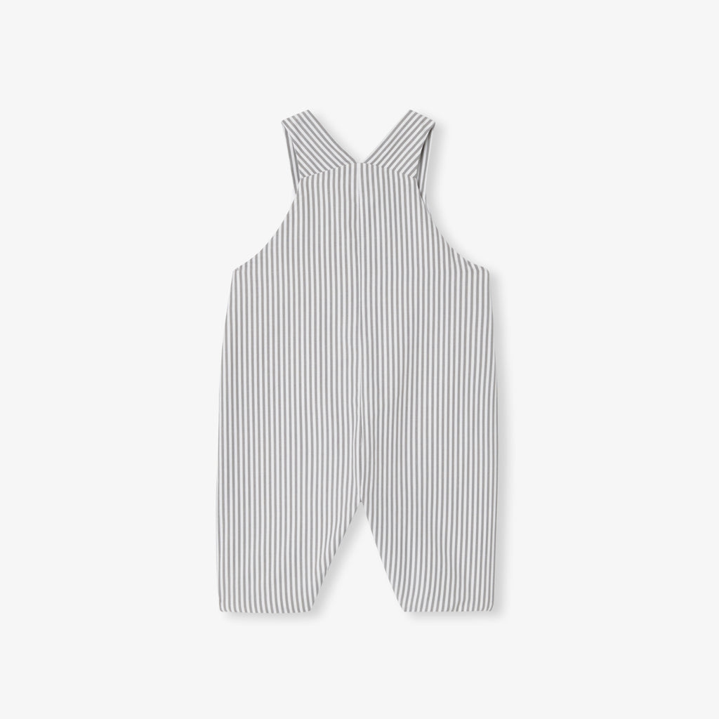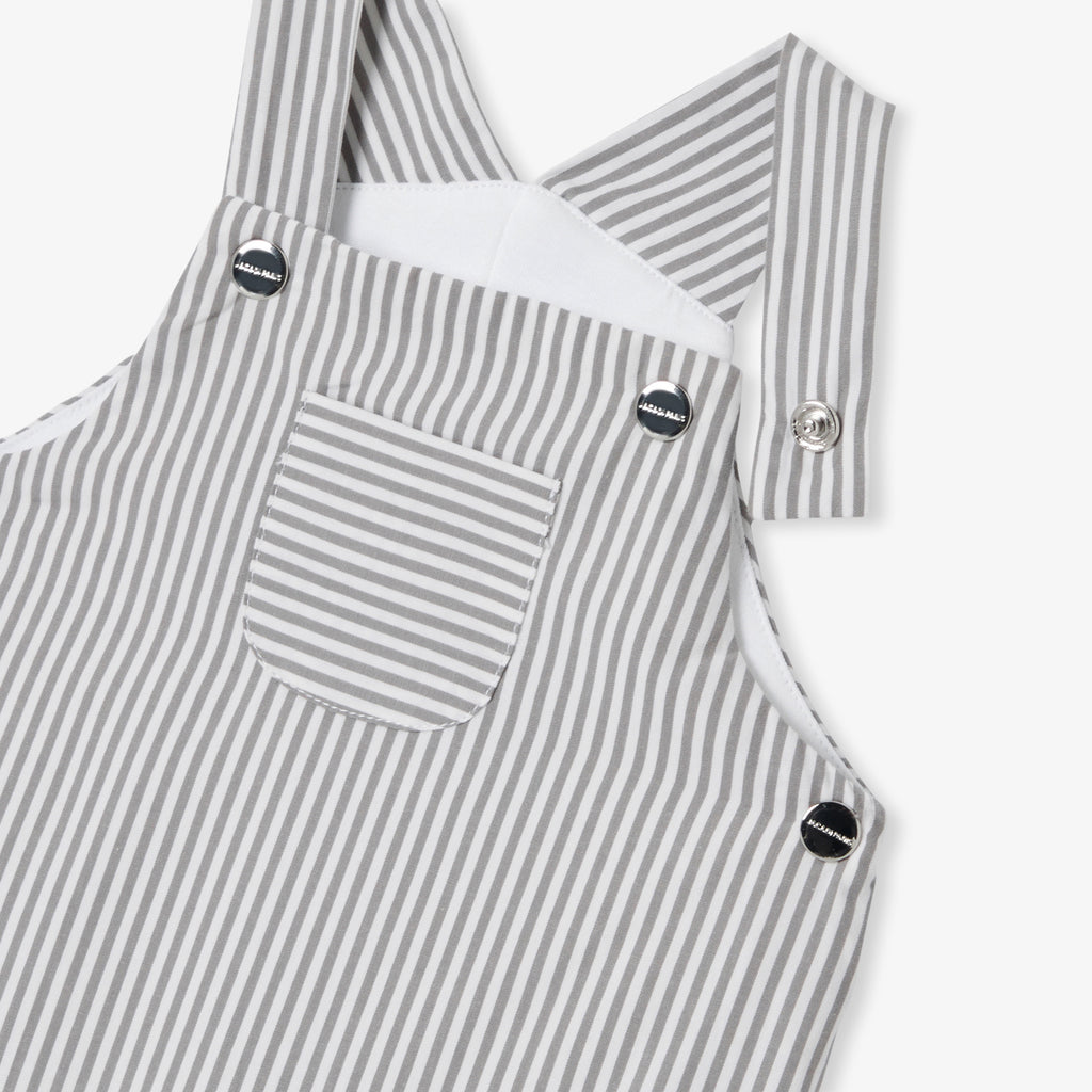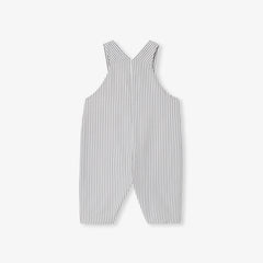 冬のワードローブの定番アイテム、ストライプポプリンのサロペット。ニットの裏地付き、軽量の中綿入りで着心地の良い一着となっています。スナップボタン開閉で実用性も高く、長袖ボディスーツとウールのカーディガンを合わせれば、シックで都会的なシルエットを楽しめます。