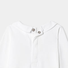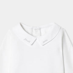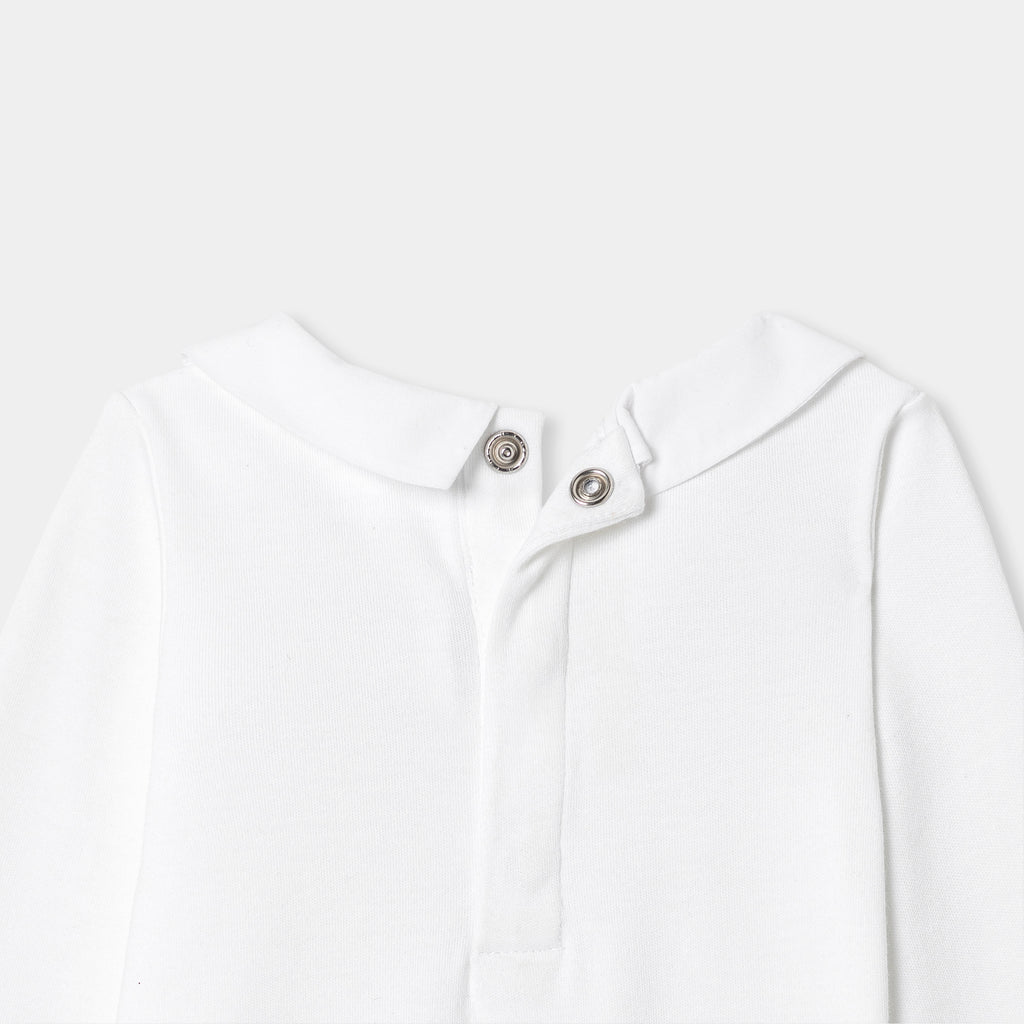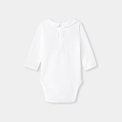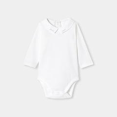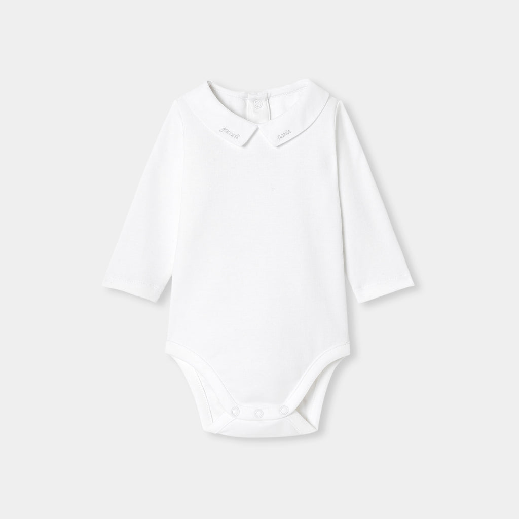 デイリーユースに欠かせない、オーガニックコットン製の長袖ボディスーツ。シンプルでミニマルなデザインに、繊細な文字刺しゅうを施したポプリン襟が美しく映えています。着心地の良さと洗練されたディテールが魅力の一着です。