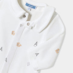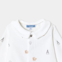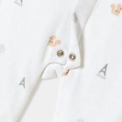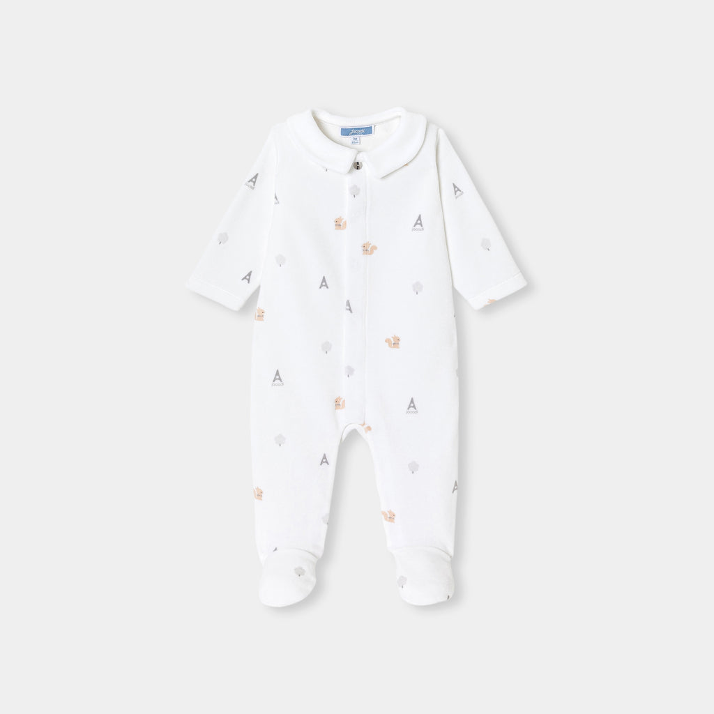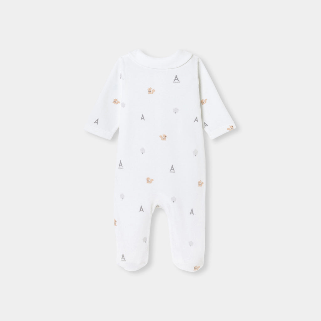 小さなリスのモチーフがキュートな足つきロンパース・パジャマ。オーガニックコットンのベロア調生地を使用しており、ポプリン襟がシックなカジュアルスタイルを演出しています。正面のスナップボタンで開閉でき、着脱も簡単。赤ちゃんに安らかな夜を約束する、今シーズンの必需品です。