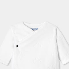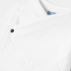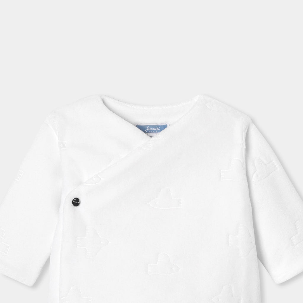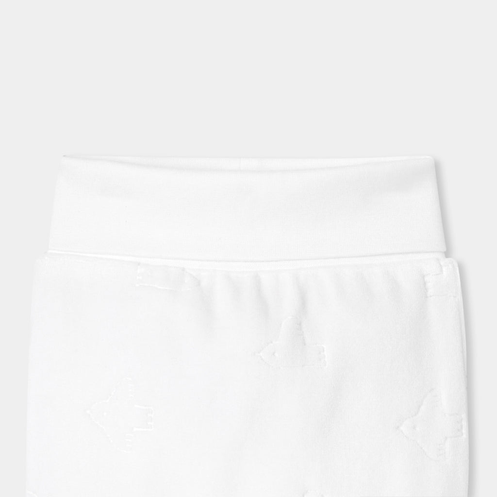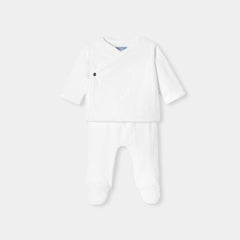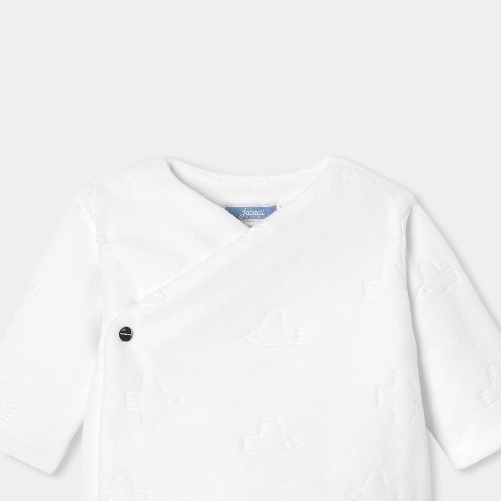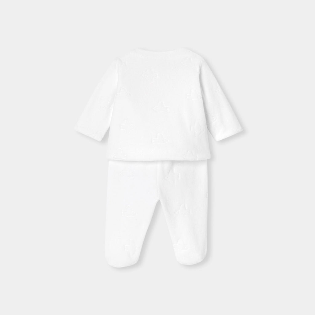 ジャカディの技術がぎゅっと詰まった、柔らかなベロア調生地のアンサンブル。暖かで柔らかなジャージー生地に全面裏地を施した前開きのカーディガンと、伸縮性のあるウエストゴム入りの履き心地の良いリブパンツが上下セットになっています。カモメのモチーフが可愛らしい、ご出産後からすぐにお使いいただけるマストアイテムです。ご自宅用にもギフトにもおすすめです。