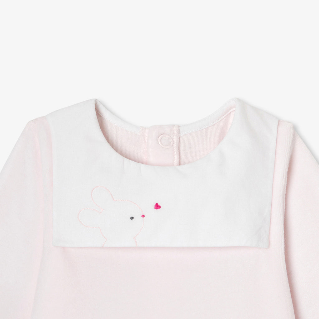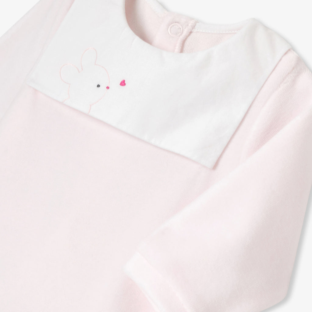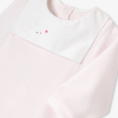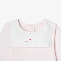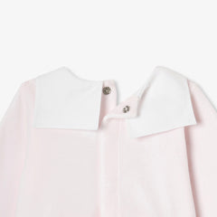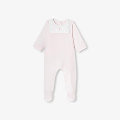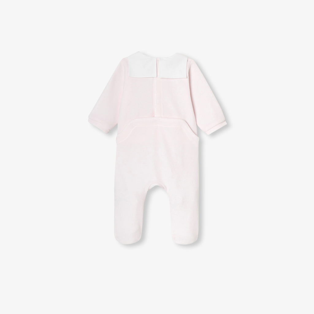 ファーストセットに選びたくなる、エレガントな足つきロンパース・パジャマ。暖かみのあるベロア調生地を使用した柔らかでシックな一着です。小さなテディベアの手刺しゅうを施したポプリンのセーラーカラー(襟)がポイントに。目立ちにくい背面のスナップボタンで簡単に着脱でき、ご自宅用にもギフトにもおすすめのアイテムです。