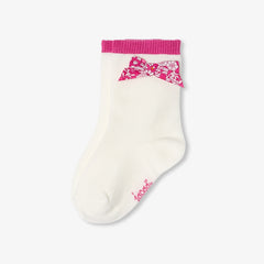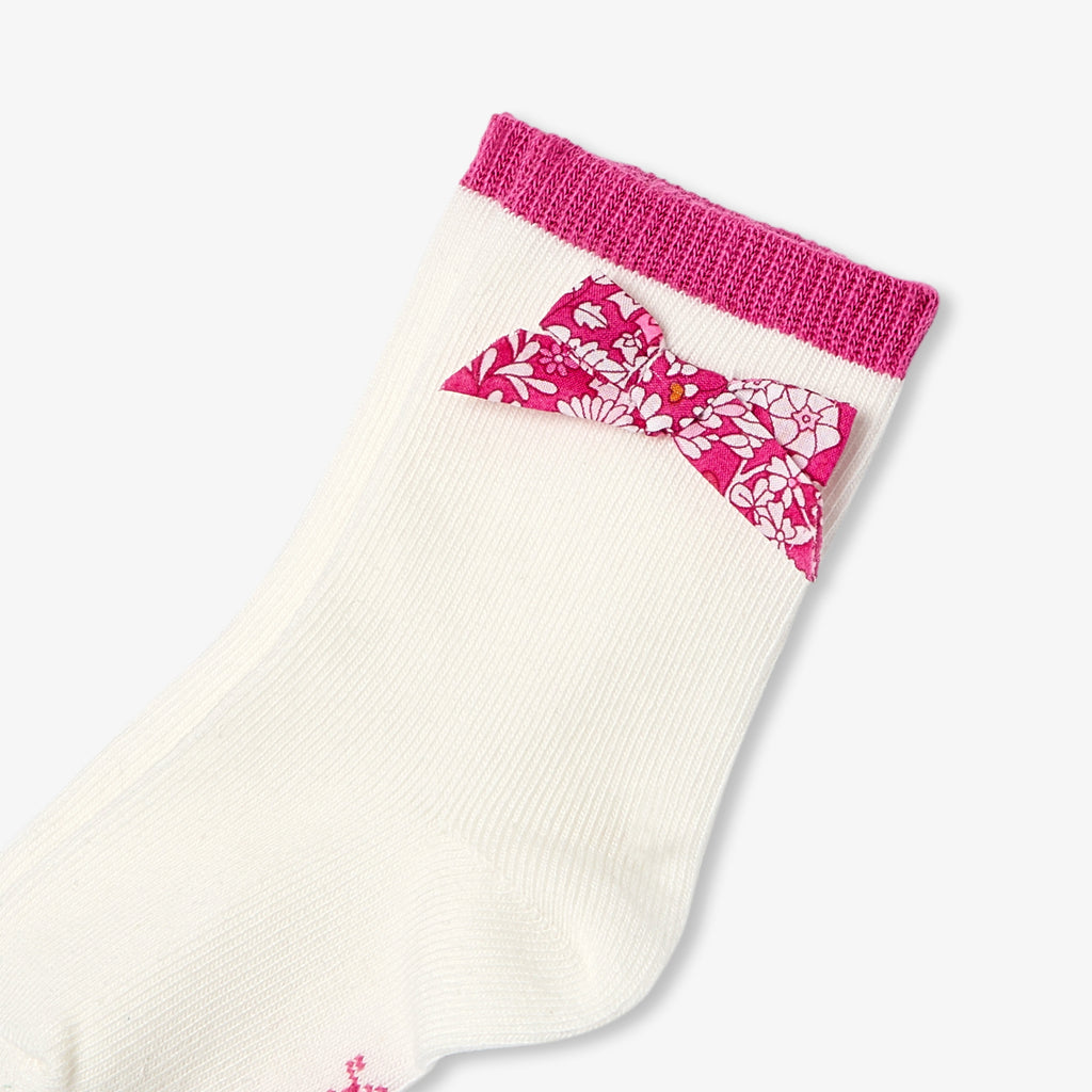履き心地の良いシックなソックス。足首にあしらった小さなリバティプリント(花柄)のリボンが可愛らしく、お洋服のコレクションとも相性抜群です。柔らかで履きやすく、秋の装いにおしゃれなタッチを添えてくれます。