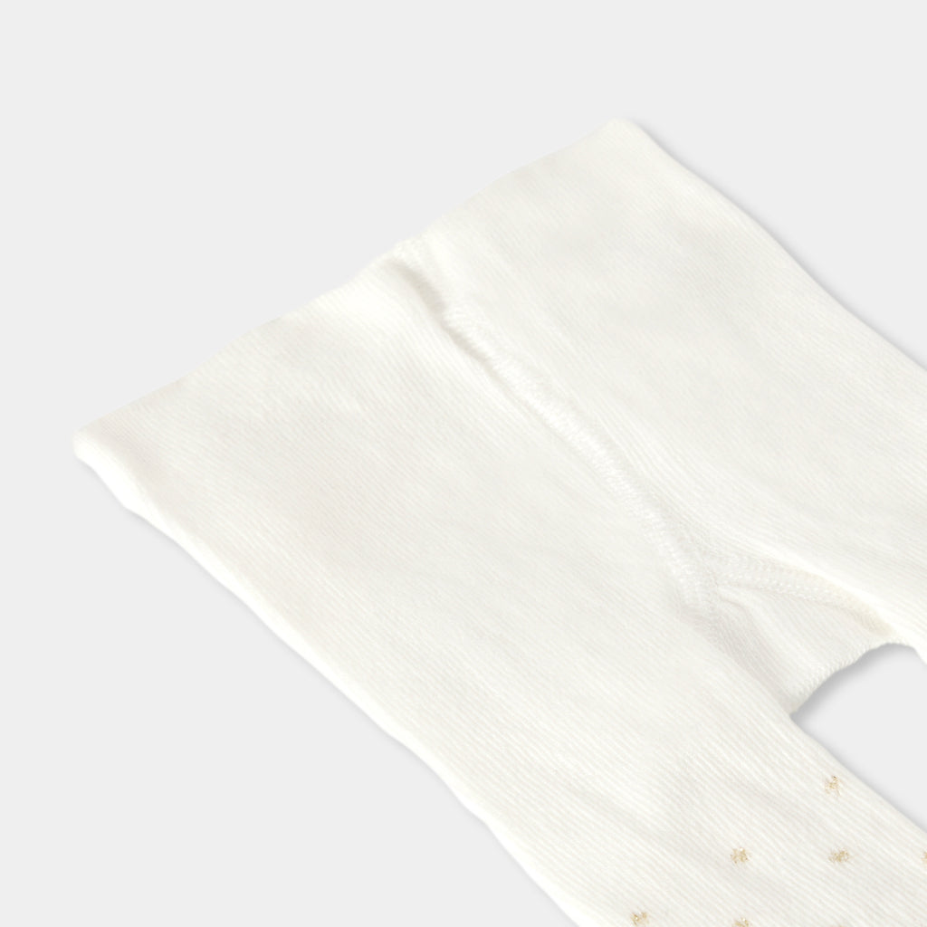 小さなゴールドドット(水玉模様)が印象的なタイツ。日常のシルエットやホリデーの装いにさりげない輝きを添えてくれます。柔らかで履きやすく、赤ちゃんのワードローブにおすすめです。