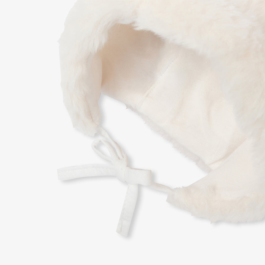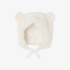 真冬に活躍する、暖かでかぶり心地の良い可愛らしいニット帽。フェイクファーを使用しており、小さな耳が付いています。赤ちゃんの頭を守るアイテムで、かぶりやすく、あご紐でしっかりとフィットします。