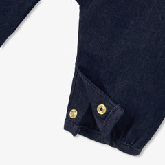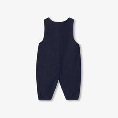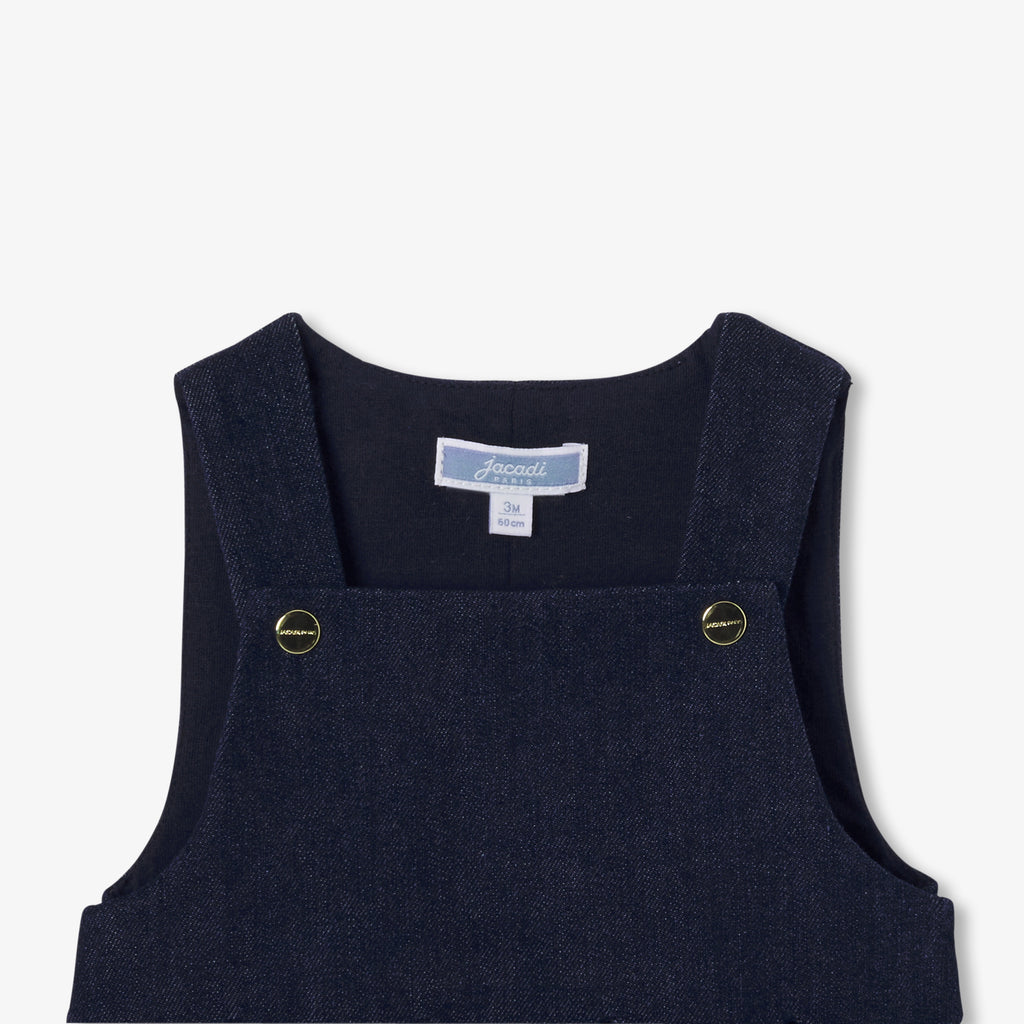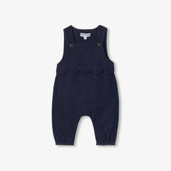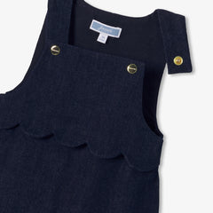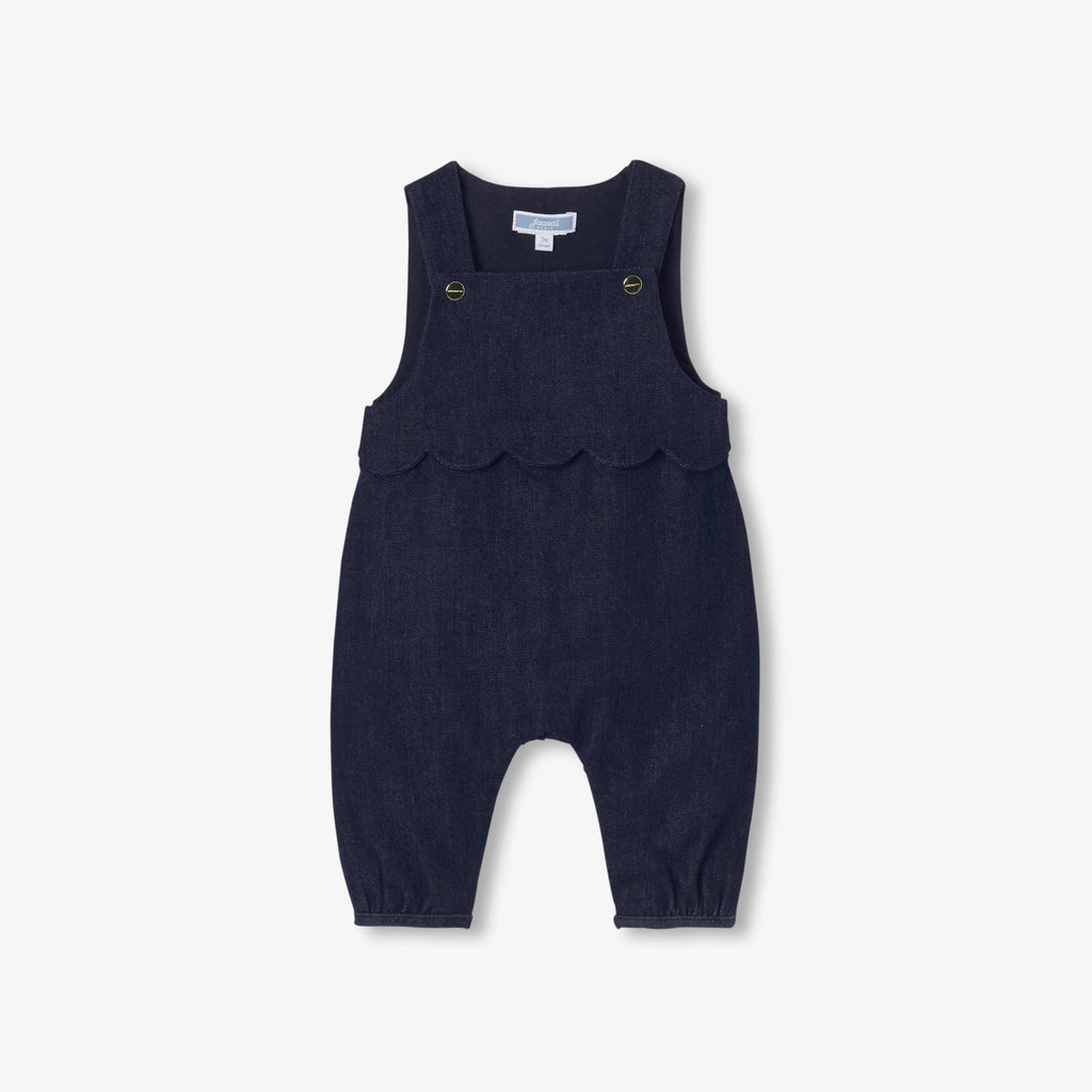 初めてのジーンズに選びたくなる、しなやかな着心地のデニムサロペット。裏地に柔らかなニット素材を使用しており、動きやすいのが特徴です。幅広スカラップが目を惹く、レトロでエレガントなモデルで、ボディスーツとレザーブーティを合わせれば、通園にも日常着にもぴったりです。