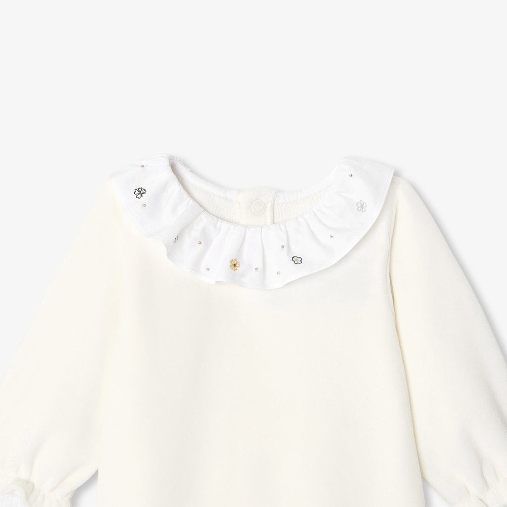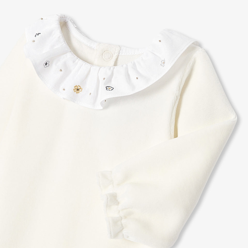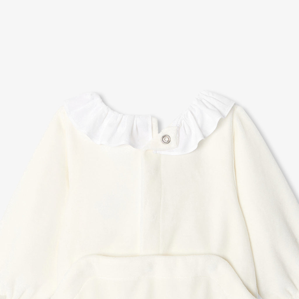 夢の世界へと赤ちゃんを誘う、シックでスリムな足つきロンパース・パジャマ。柔らかでしなやかなベロア調生地を使用した一着で、手刺しゅう入りのポプリン襟がポイントに。背面で開閉でき、着脱も簡単です。