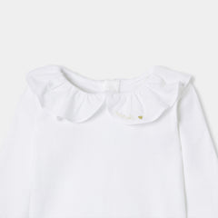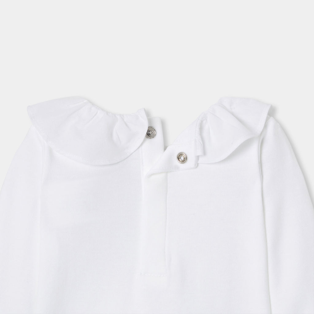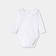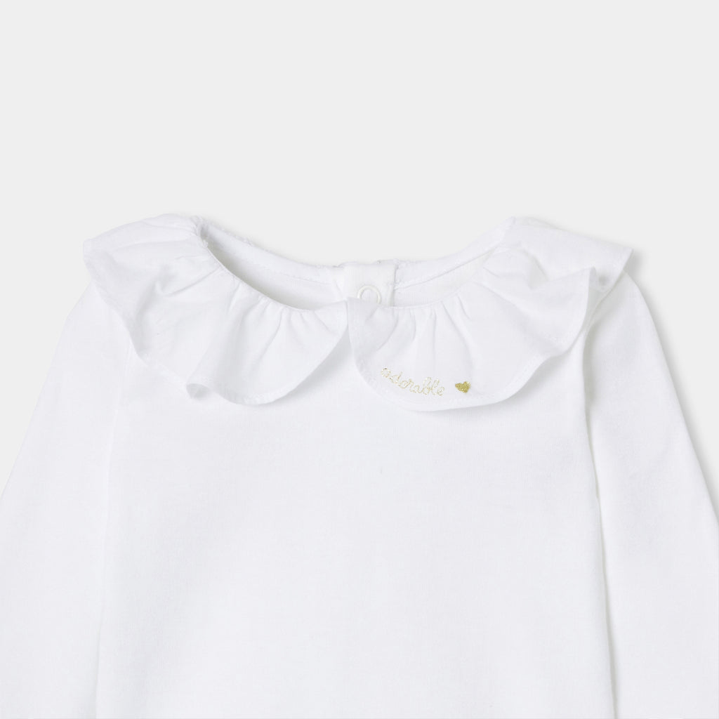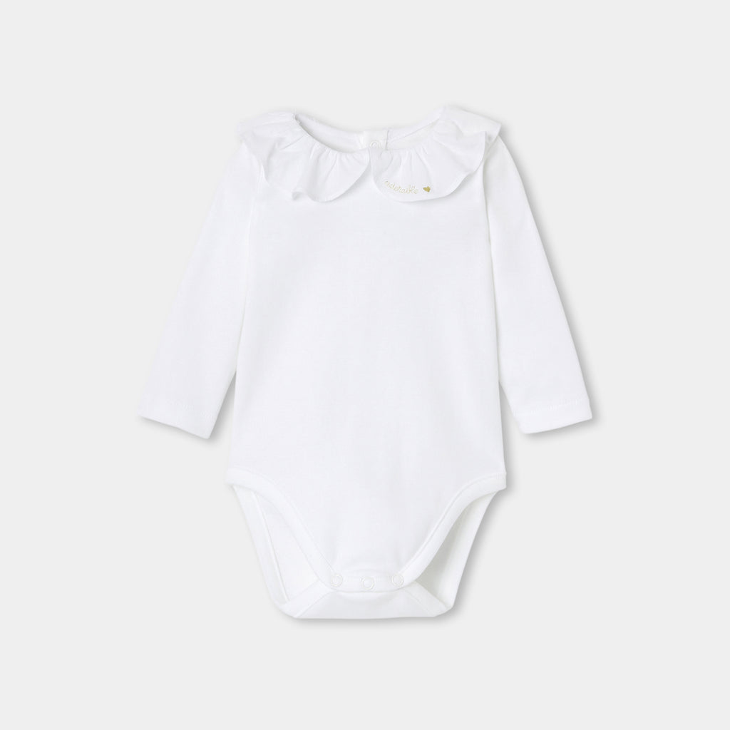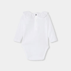 赤ちゃんの日常にエレガンスをもたらすボディスーツ。小さなハートと可愛らしい文字刺しゅう入りの襟が特徴です。柔らかでしなやかなオーガニックコットンを使用した一着で、リバティプリント(花柄)のブルマやサロペットを合わせるとシックでロマンチックなシルエットが完成します。