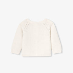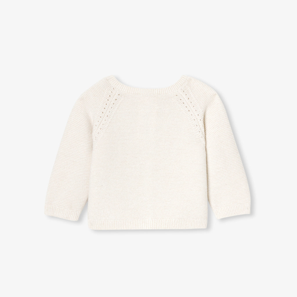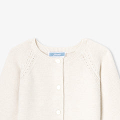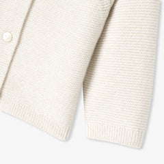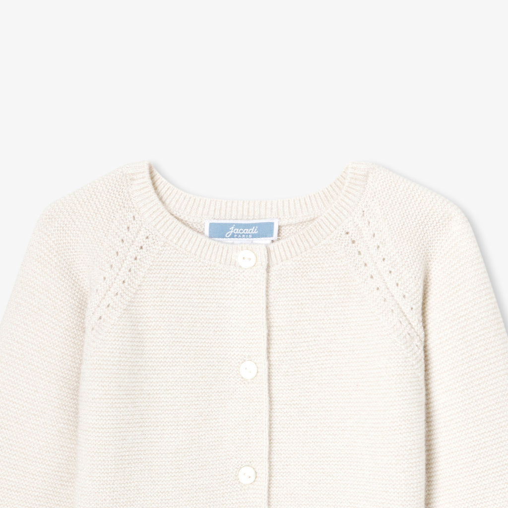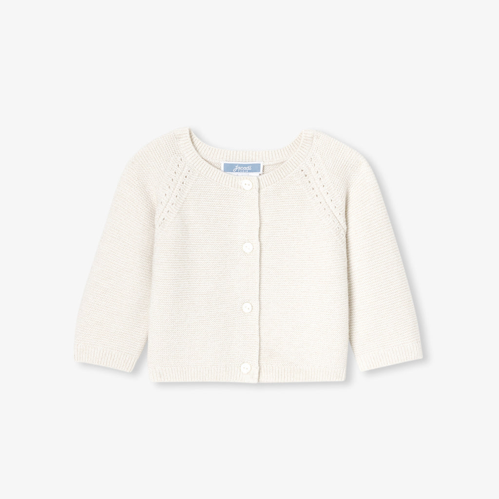 エレガントな雰囲気漂う、暖かでしっかりとしたガーター編みのウールニットカーディガン。さりげないゴールドのラメ、繊細なポインテールニットの透かし編み、飾りボタンがポイントの華やかなモデルです。ミッドシーズンの装いをシックに演出してくれます。