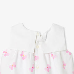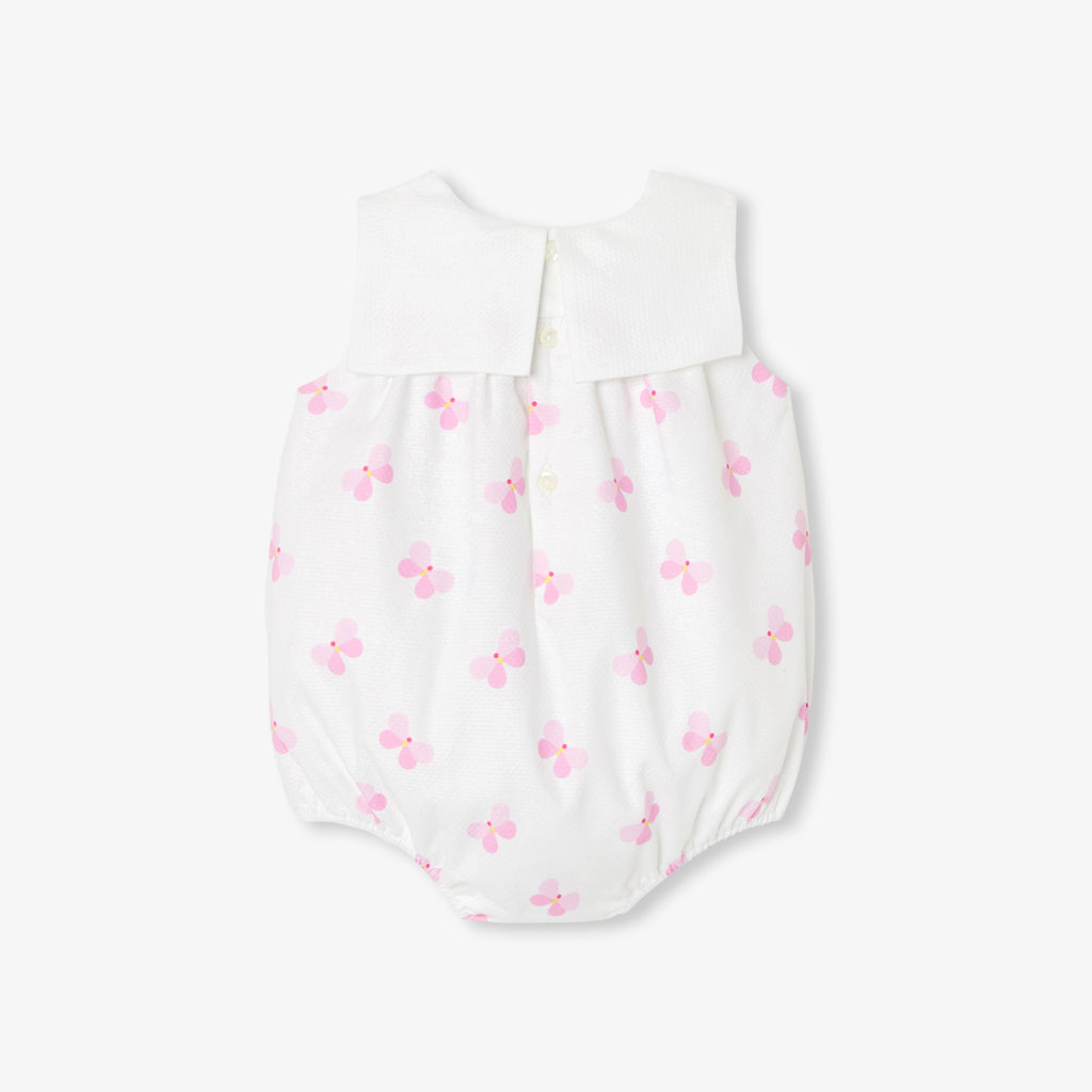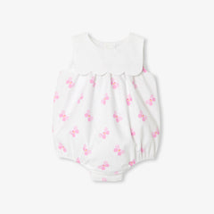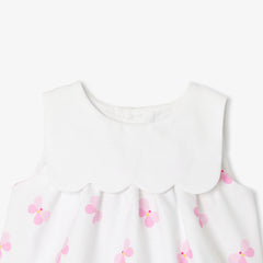 陽ざしが心地よい季節に映える、軽やかなコットンピケのロンパース。背面のボタンと目立ちにくい股下のスナップボタンで着せやすく、スカラップの胸当てや蝶のプリント、ウエストギャザーがモダンで上品なシルエットを演出します。夏のお出かけや、特別な日の装いにもおすすめです。