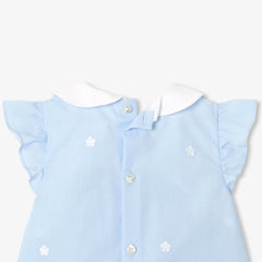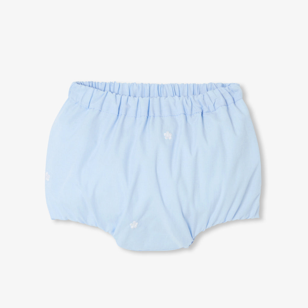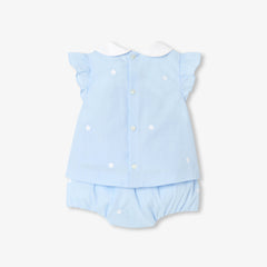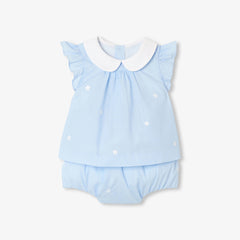 背面ボタン仕様のトップスに、ピーターパンカラー(襟)とフリル付きアームホールをあしらい、総裏地付きのブルマを組み合わせました。