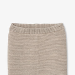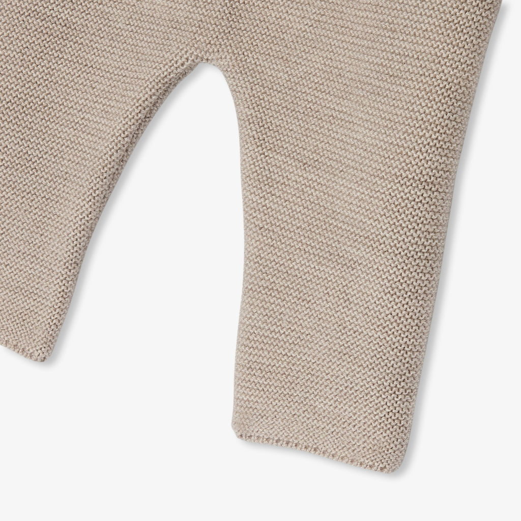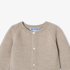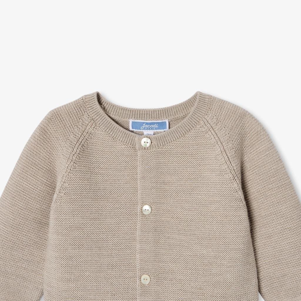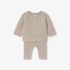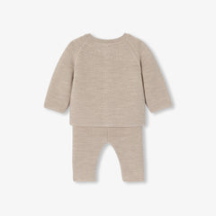魅力たっぷりのニットアンサンブル。柔らかで暖かなウールを使用しており、ボタン留めのカーディガンと伸縮性のあるウエストゴム入りパンツが上下セットになっています。実用性が高く、どんなシーンでも活躍すること間違いなし。ご自宅用やギフト、ファーストセットにもおすすめのアイテムです。