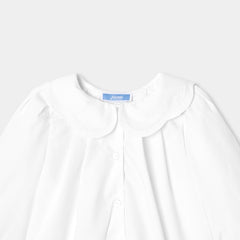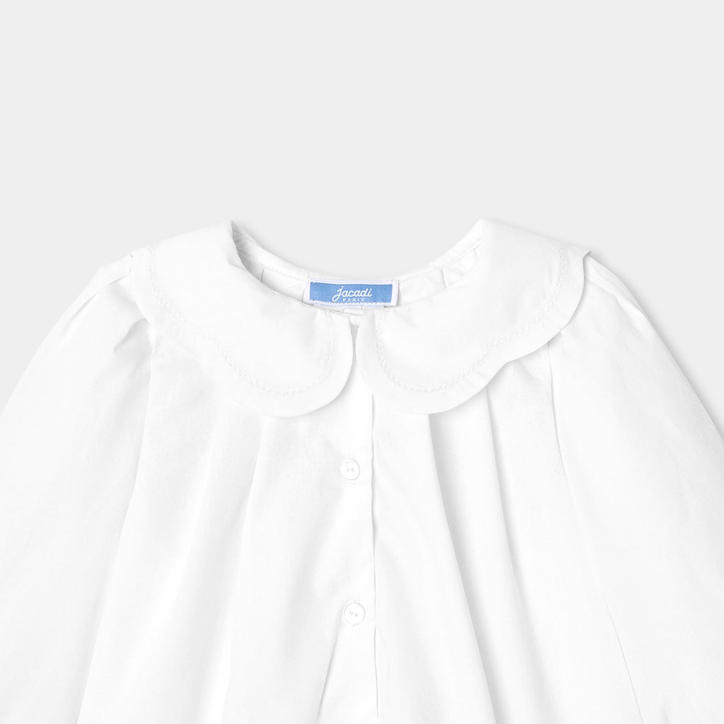ジャカディのエレガンスと技術がぎゅっと詰まったブラウス。コットンポプリンを使用した、上品でクラシカルなブラウス。スカラップ仕上げの大きな襟には繊細なカットワークとタックをあしらい、華やかさを添えました。普段着にも、ホリデーシーズンにも活躍します。