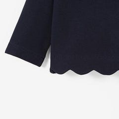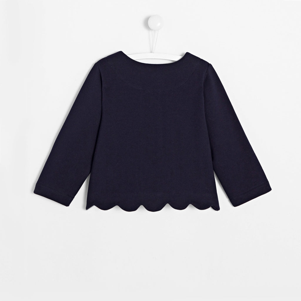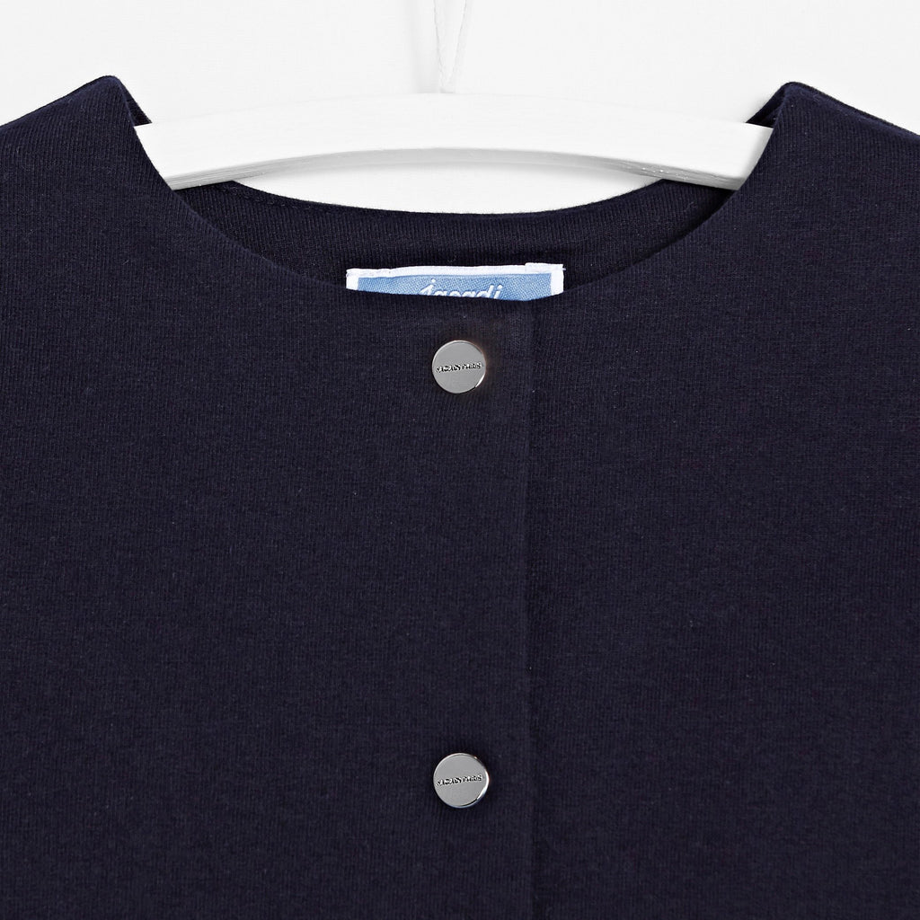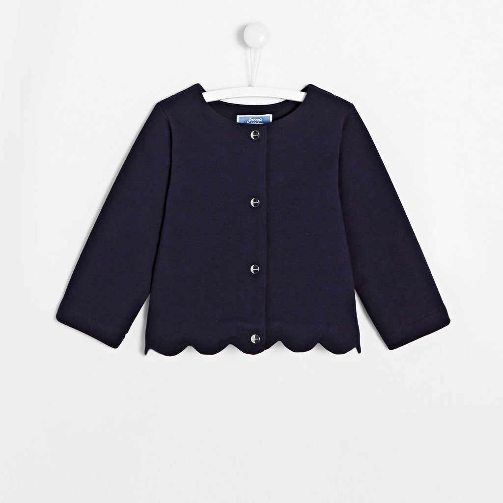 ジャカディの定番、スカラップ裾がアイコニックなカーディガン。肌触りの良いフリース素材を使用し、内側には柔らかいブラッシュ加工が施されています。裾のスカラップデザインがモダンな印象を与え、スナップボタンで着脱も簡単。合わせやすいカラーバリエーションで、ドレスやブラウスとの相性も抜群です。