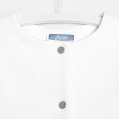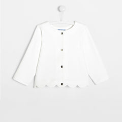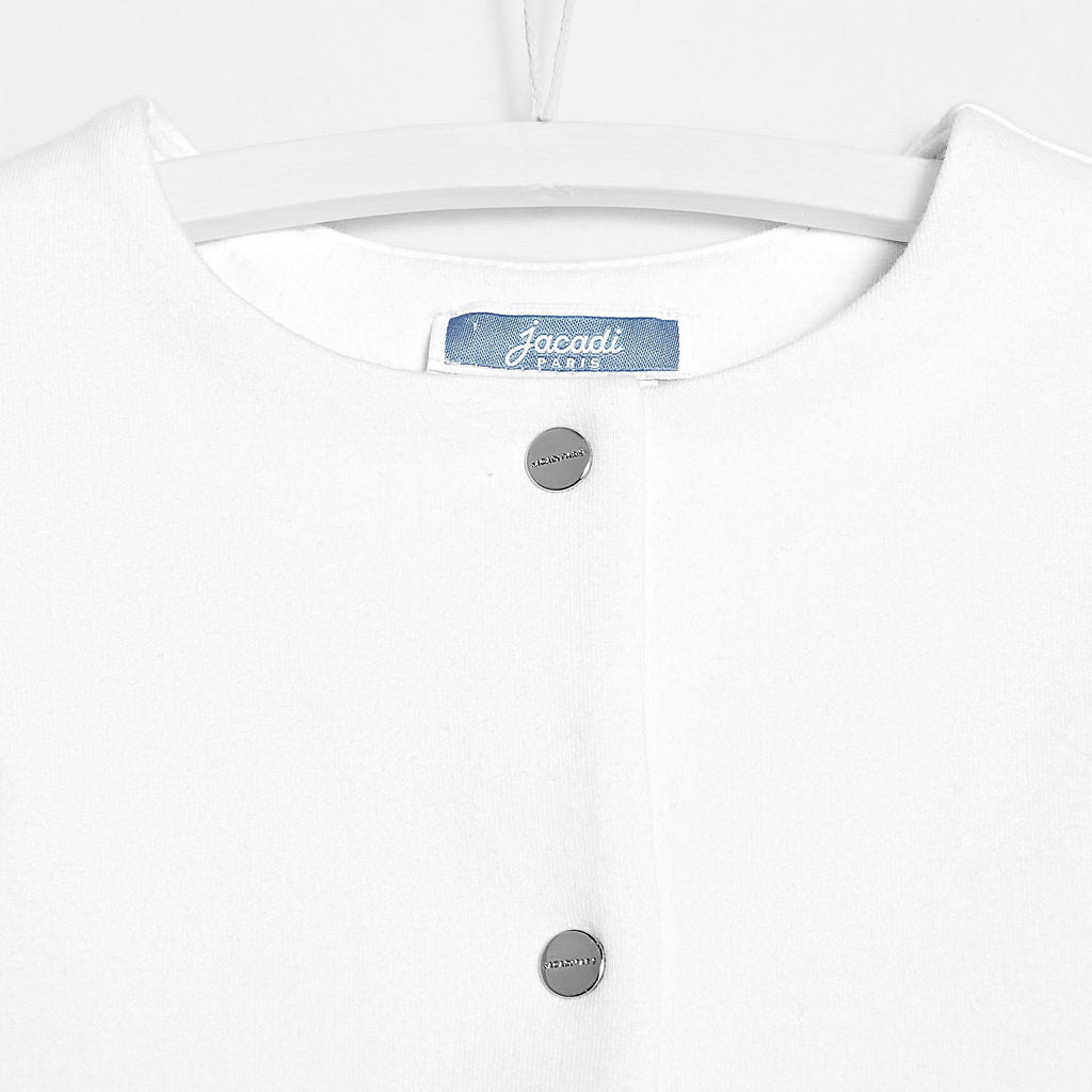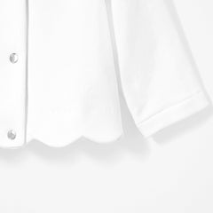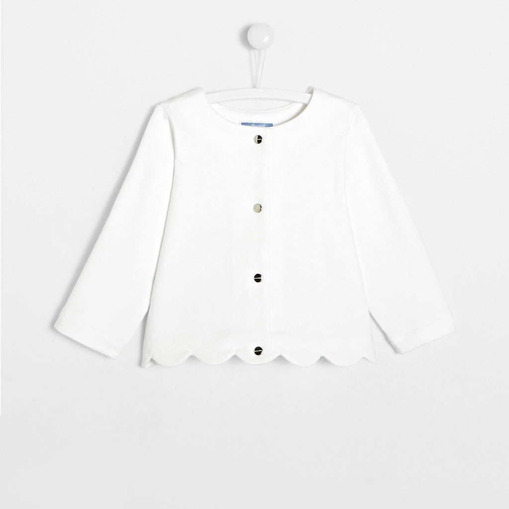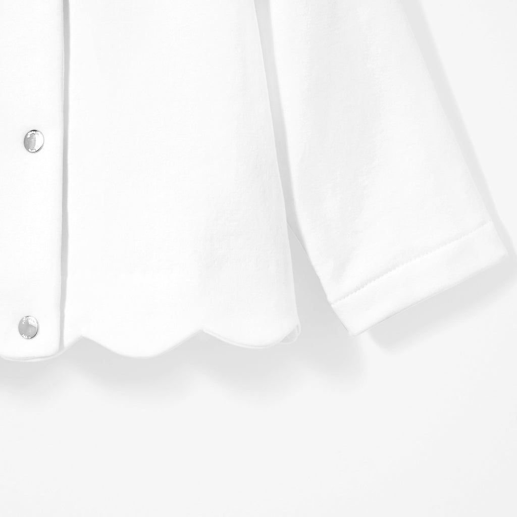 ジャカディの定番、スカラップ裾がアイコニックなカーディガン。肌触りの良いフリース素材を使用し、内側には柔らかいブラッシュ加工が施されています。裾のスカラップデザインがモダンな印象を与え、スナップボタンで着脱も簡単。合わせやすいカラーバリエーションで、ドレスやブラウスとの相性も抜群です。
