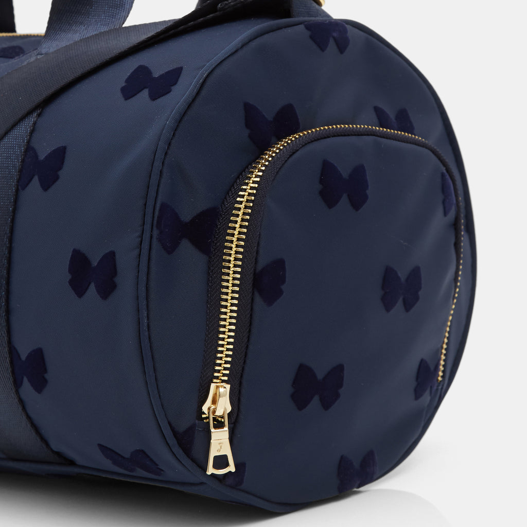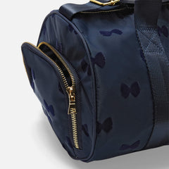 ダンスレッスンや旅行に大活躍な可愛らしいリボン柄のナイロンバッグ。ファスナー開閉、靴も入れられるサイドのファスナーポケット付きで、スポーツウェアや着替えの持ち運びにぴったり。
