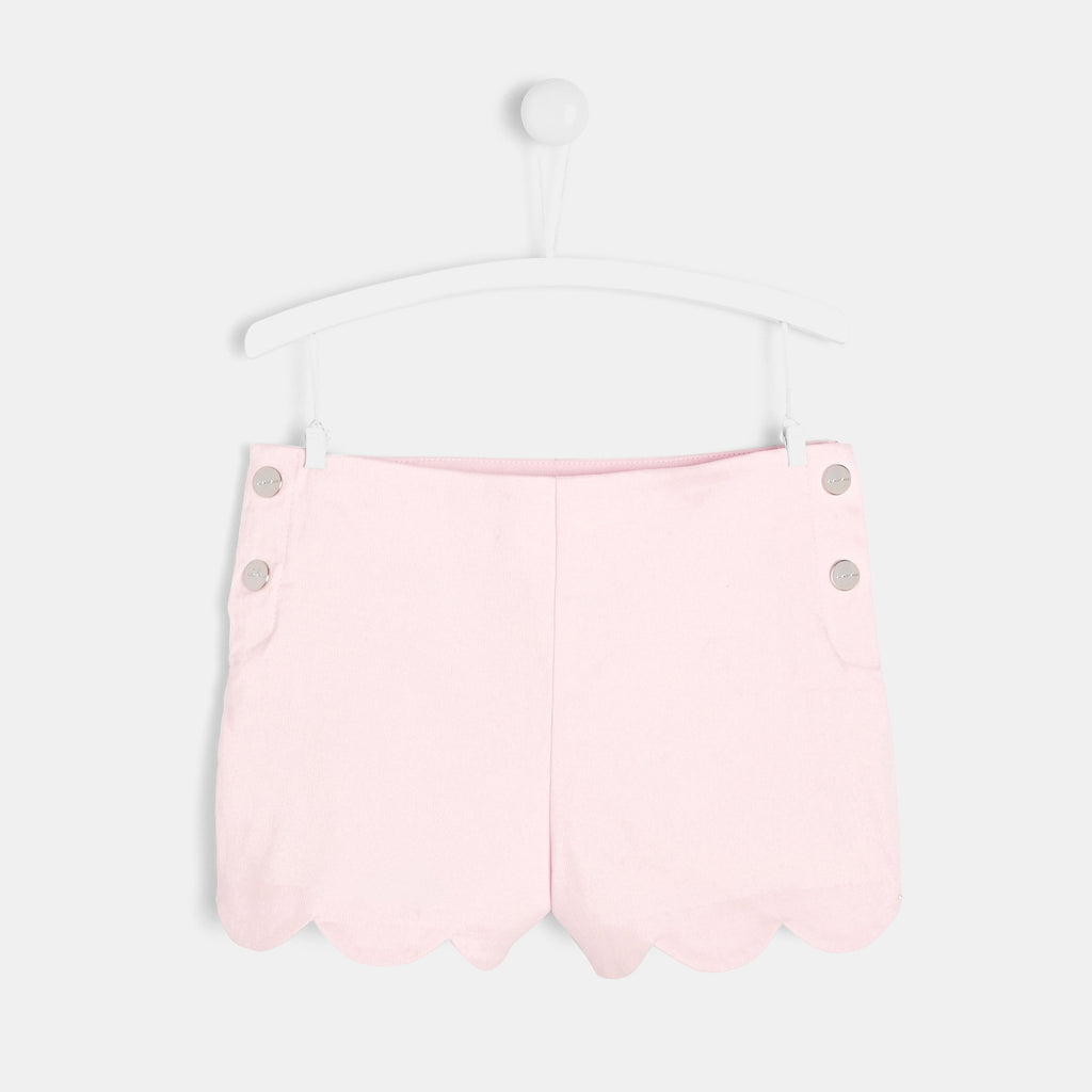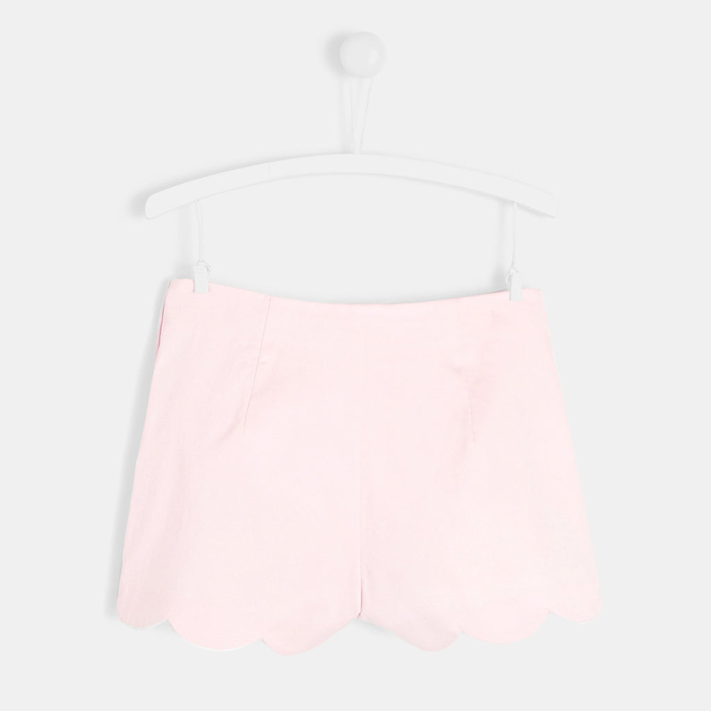 コットンピケのショートパンツで海辺へ出発。上品なスカラップ裾は桟橋でも公園でも、どんな外出にもぴったり。調整可能なゴムウエストとスナップボタン付きで履きやすく、シンプルなデザインでコーディネートしやすいパンツです。