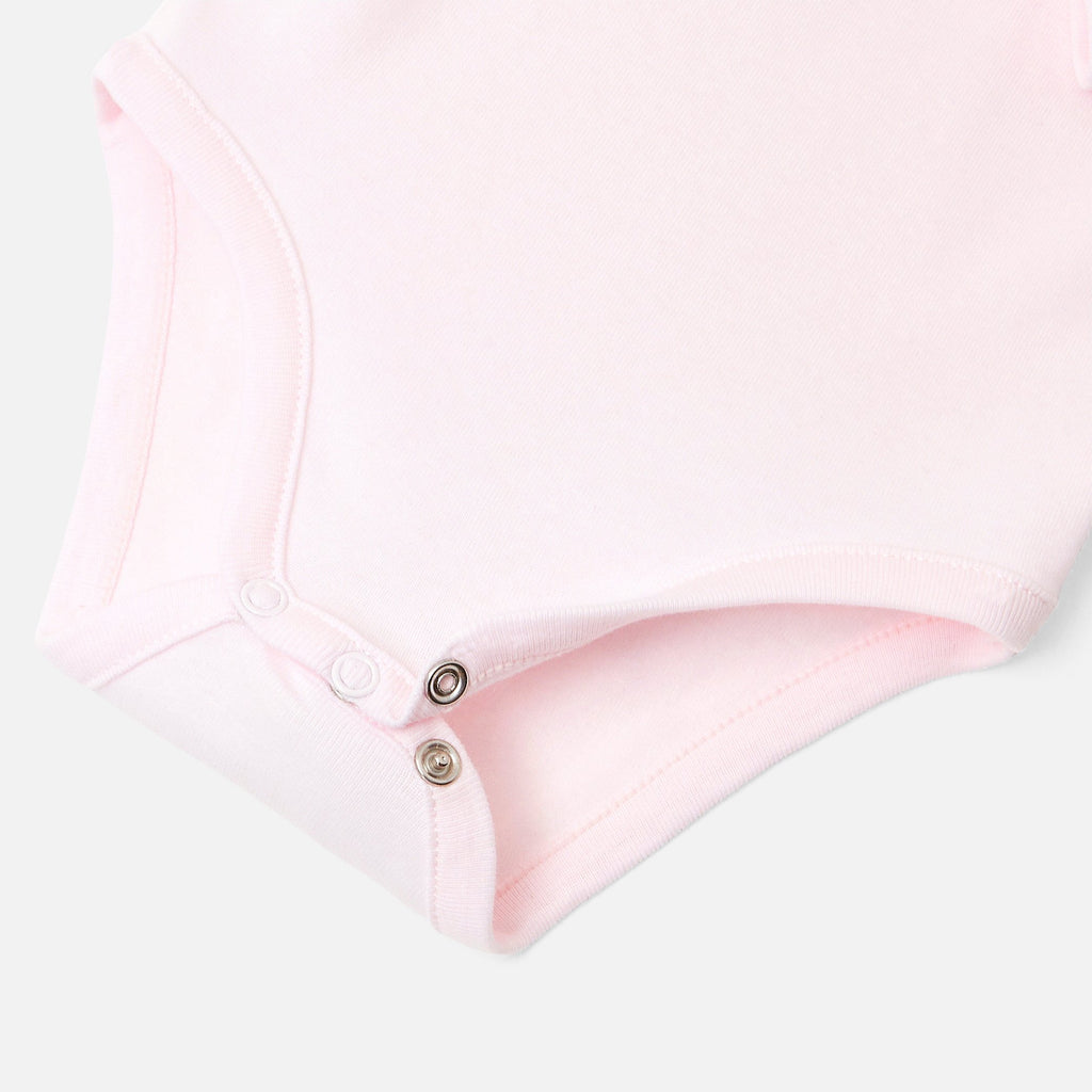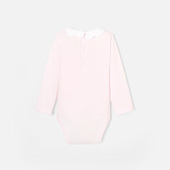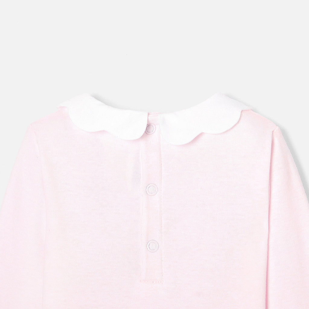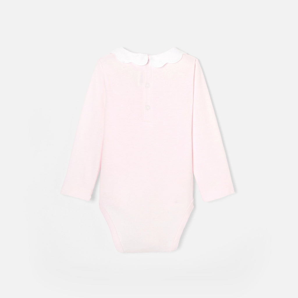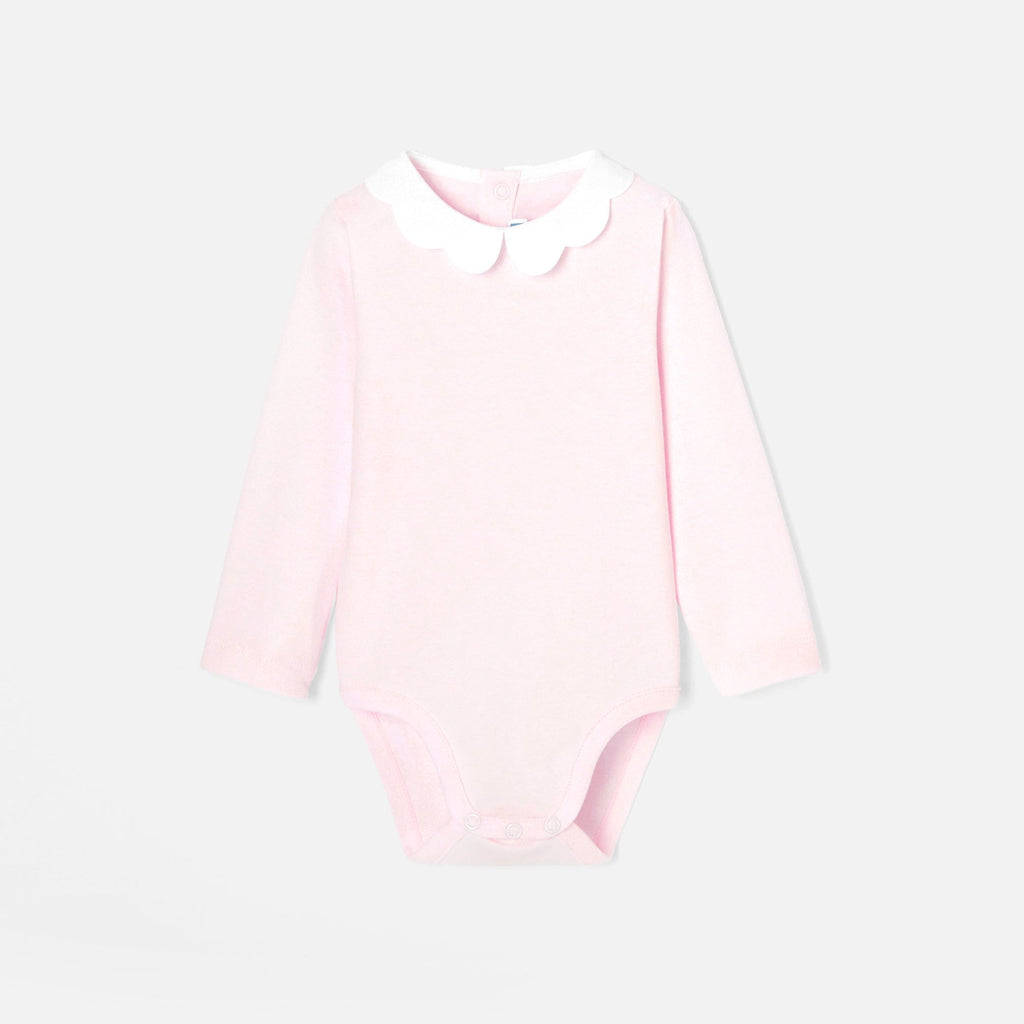 ピンクにスカラップ襟がチャーミングな長袖ボディスーツ。日常使いしやすく、袖なしワンピースやサロペットとのレイヤードにおすすめです。カーディガンを羽織ってお出掛けコーディネートにも。
