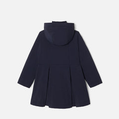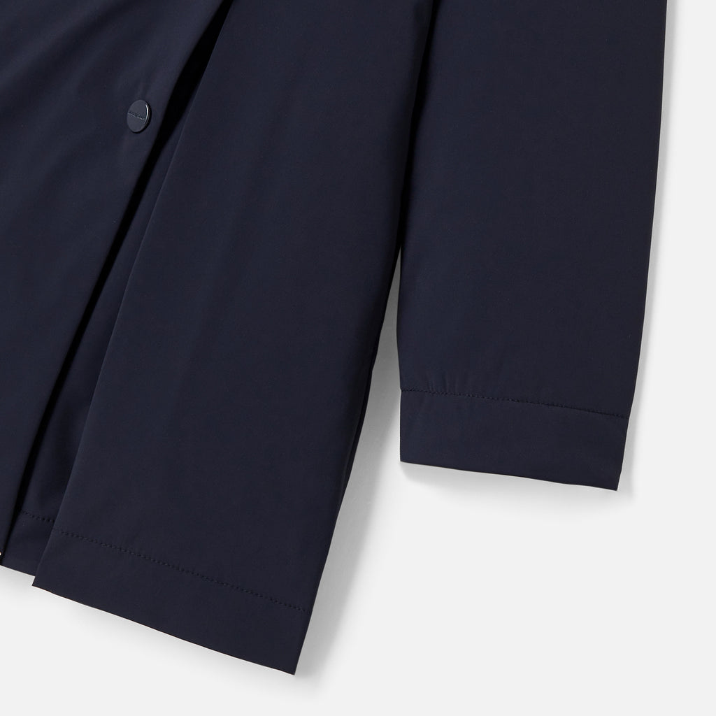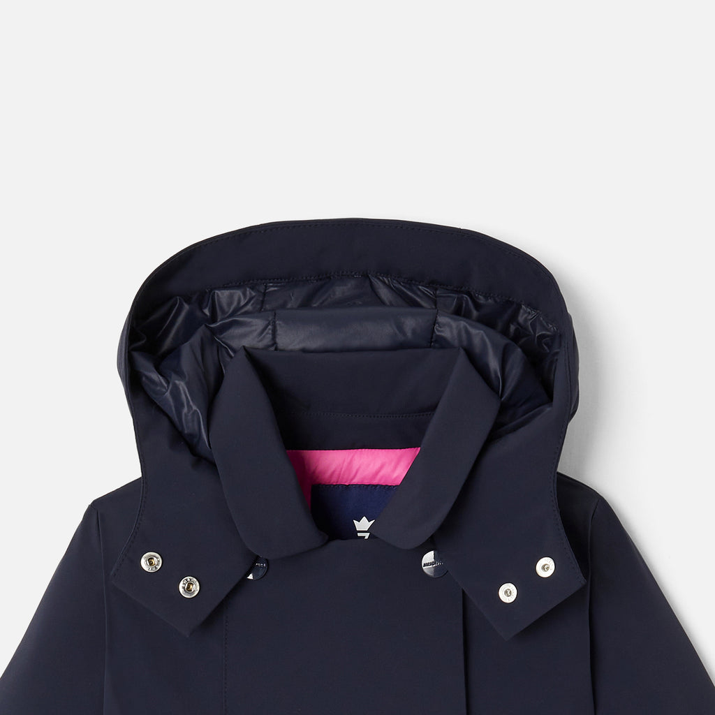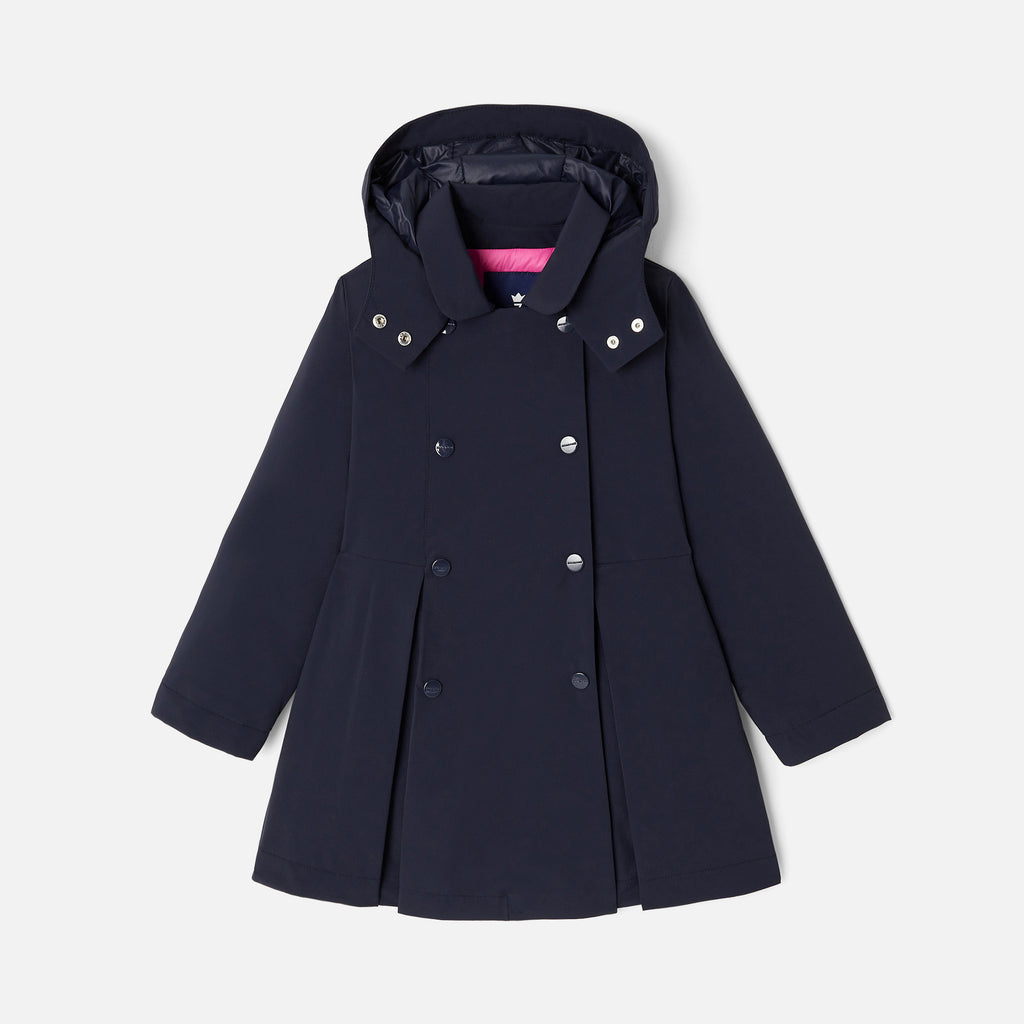 ジャカディの技術が詰まった、シックな撥水加工の中綿入りコート。トレンチコートのようなデザインで、キルティングの裏地、ボックスプリーツの裾が美しい一着。ワイド幅のジーンズとブラウスを合わせれば、チャーミングなフレンチコーディネートが完成します。