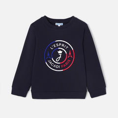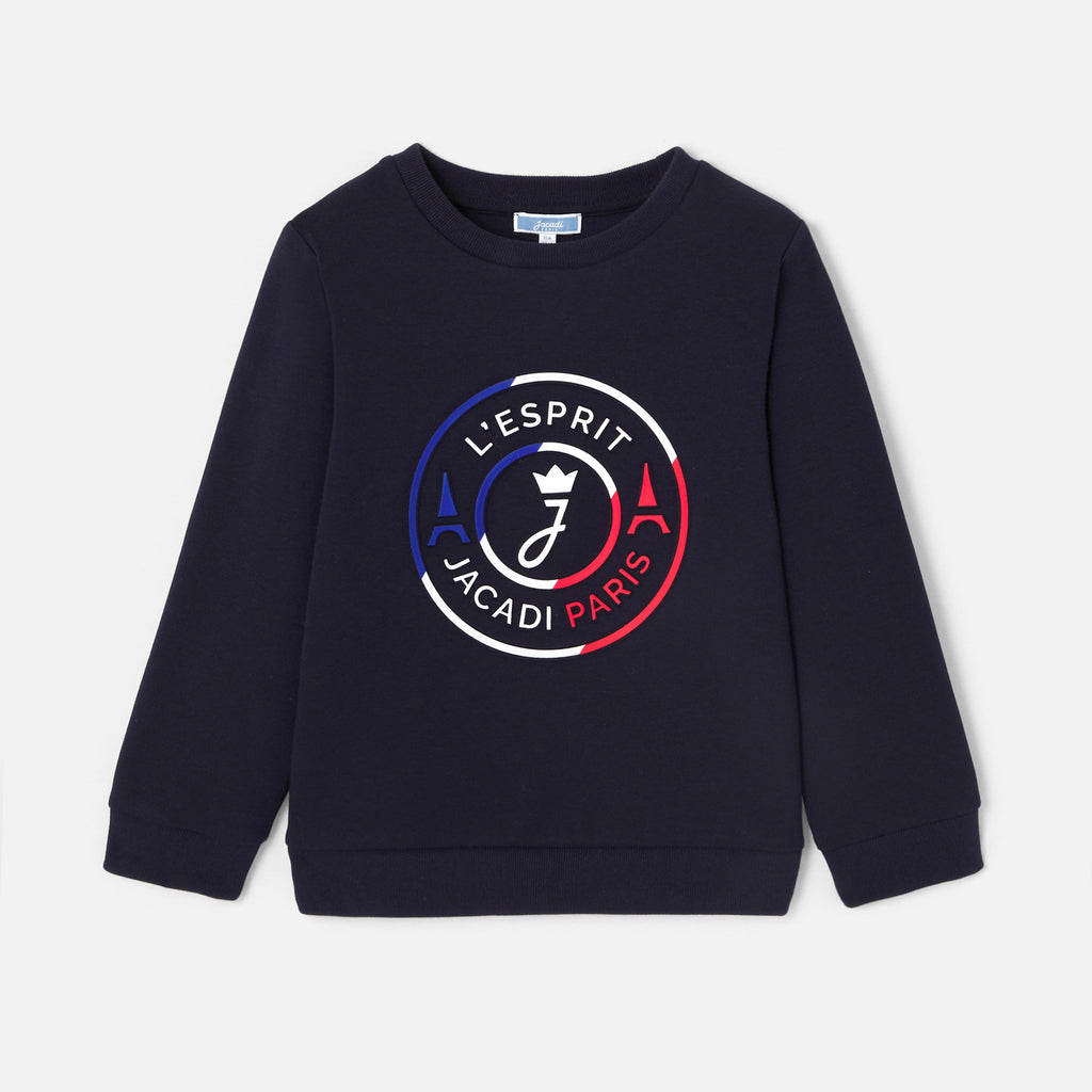春のワードローブに欠かせない、柔らかでしなやかなスウェット。トリコロールカラーの "L'esprit Jacadi" エンボス加工プリントをあしらったスポーティーシックなモデル。ジーンズやパーカーとの相性も抜群です。
