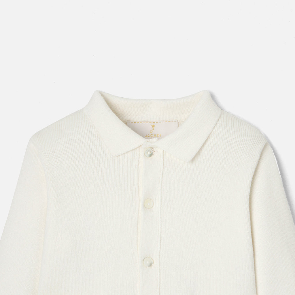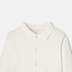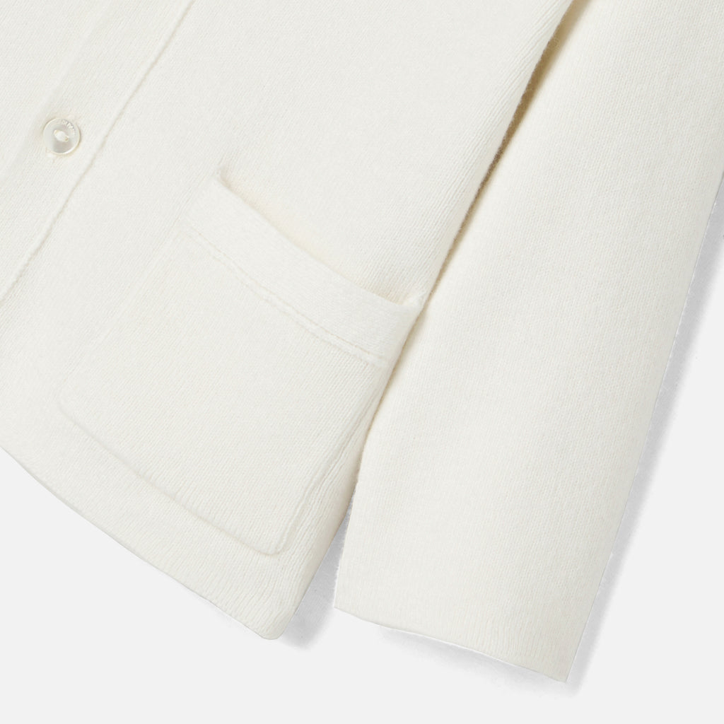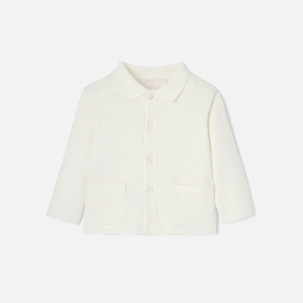 特別な日の装いをエレガントに彩る、ホワイトカラーのカーディガン。襟とパッチポケット付きで、シャツとパンツ、サンダルを合わせればお祝いの場にもぴったりです。