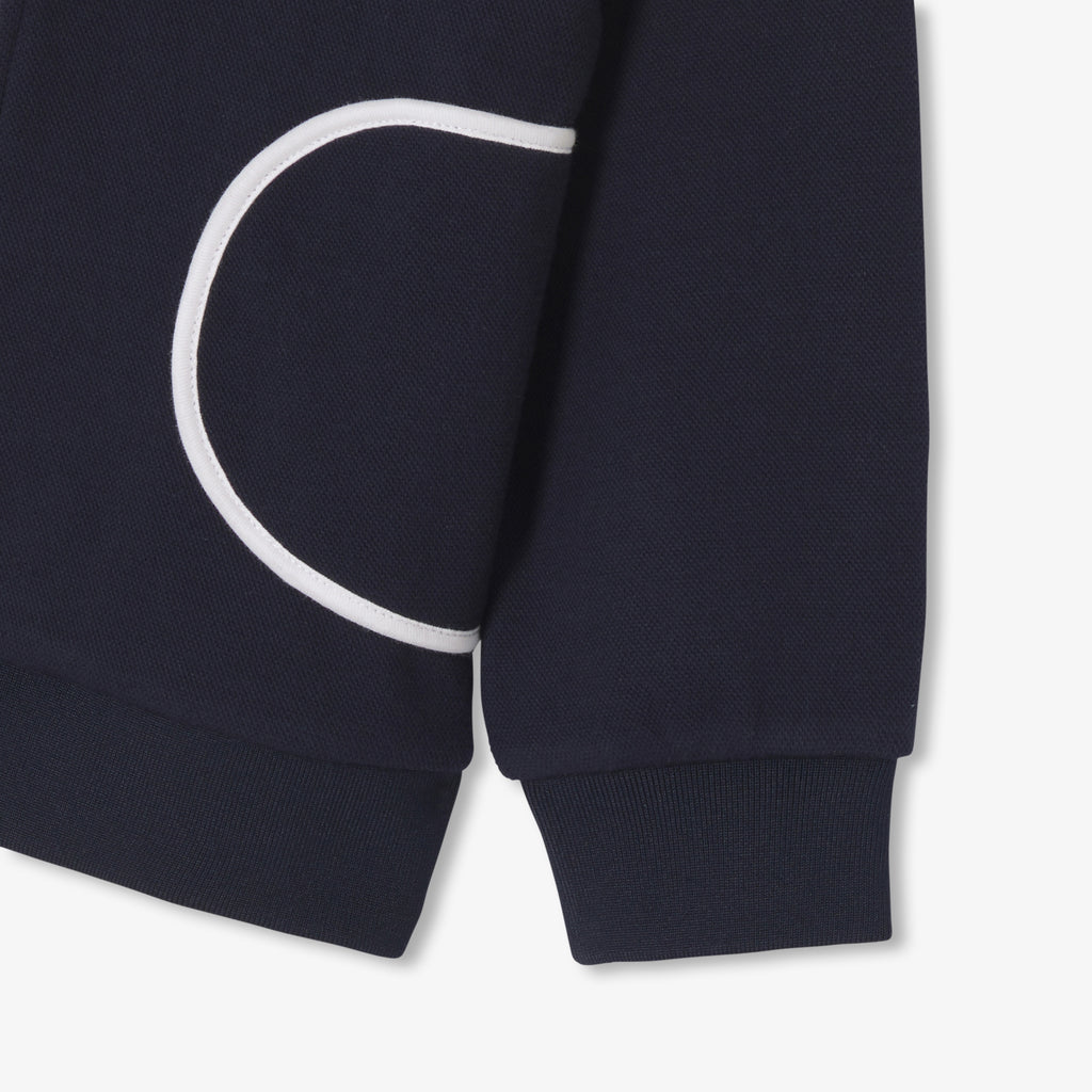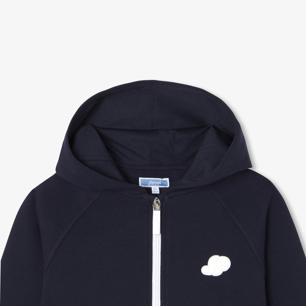 シックでカジュアルなシルエットのジップアップスウェット。 コットンピケを使用しており、フードとホワイトの縁取りをあしらったパッチポケットが特徴的。 ファスナーで開閉でき、お揃いのジョガーパンツ(別売り)を合わせて日常着に。