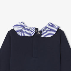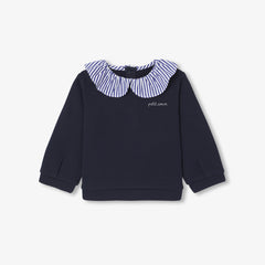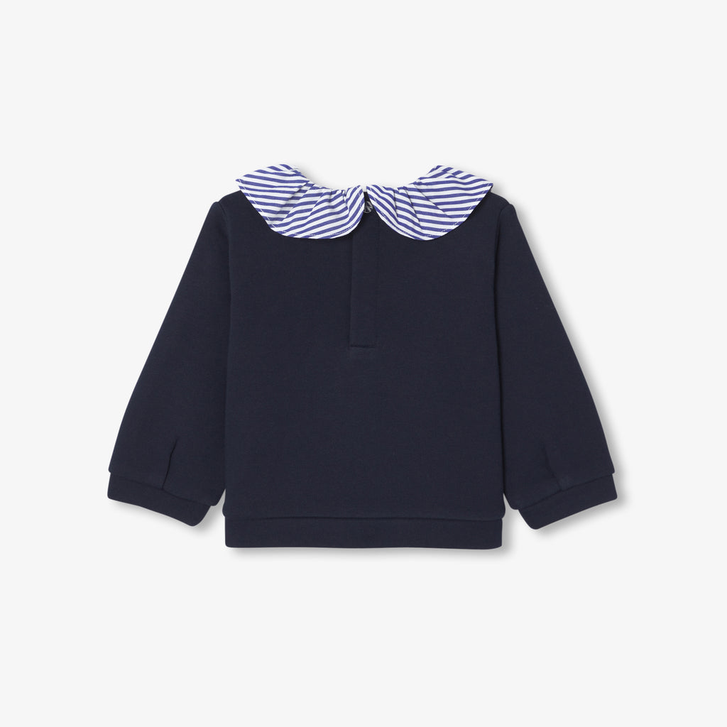 柔らかなフリースの着心地とストライプフリルのモダンなエレガンスが融合したスウェット。背中のスナップボタンで着脱も簡単です。ジーンズとスニーカーに合わせれば、カジュアルなシルエットがすぐに完成。ミッドシーズンのマストアイテムです。