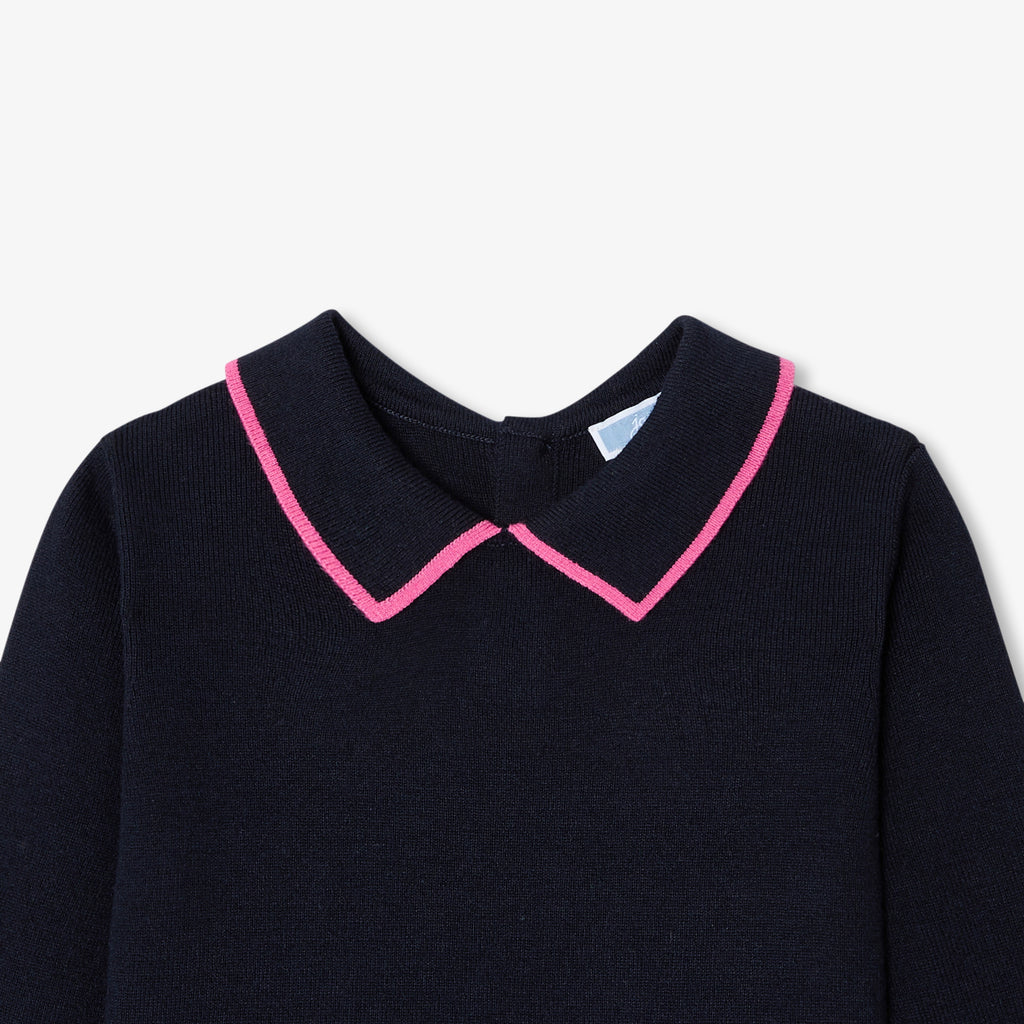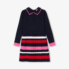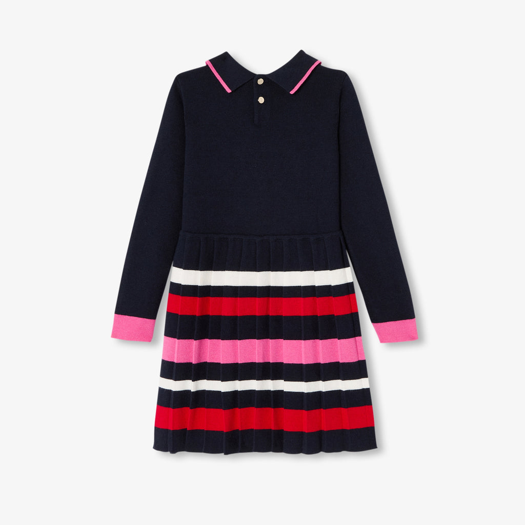 ジャカディの技術を詰め込んだ、モダンでエレガントなワンピース。ニットコットンにカシミヤをほんのりブレンドし、ポロ襟、コントラストの効いた袖口、ストライプのプリーツスカートが軽やかな動きを演出。足元にメリージェーンを合わせれば、新学期から元気に過ごせる一着です。