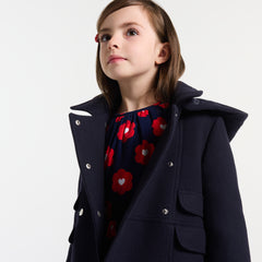 実用的でシックなコートで、通園・通学をもっと楽しく。飾りポケットと本物のフラップポケット、取り外し可能なフード、裏地付き。軽量の中綿入りで暖かな、ウール製の英国風コートです。デニムワンピースの上に羽織ったり、ワイドパンツとメリージェーンに合わせてプレッピーに着こなしたり、デイリーに着られます。