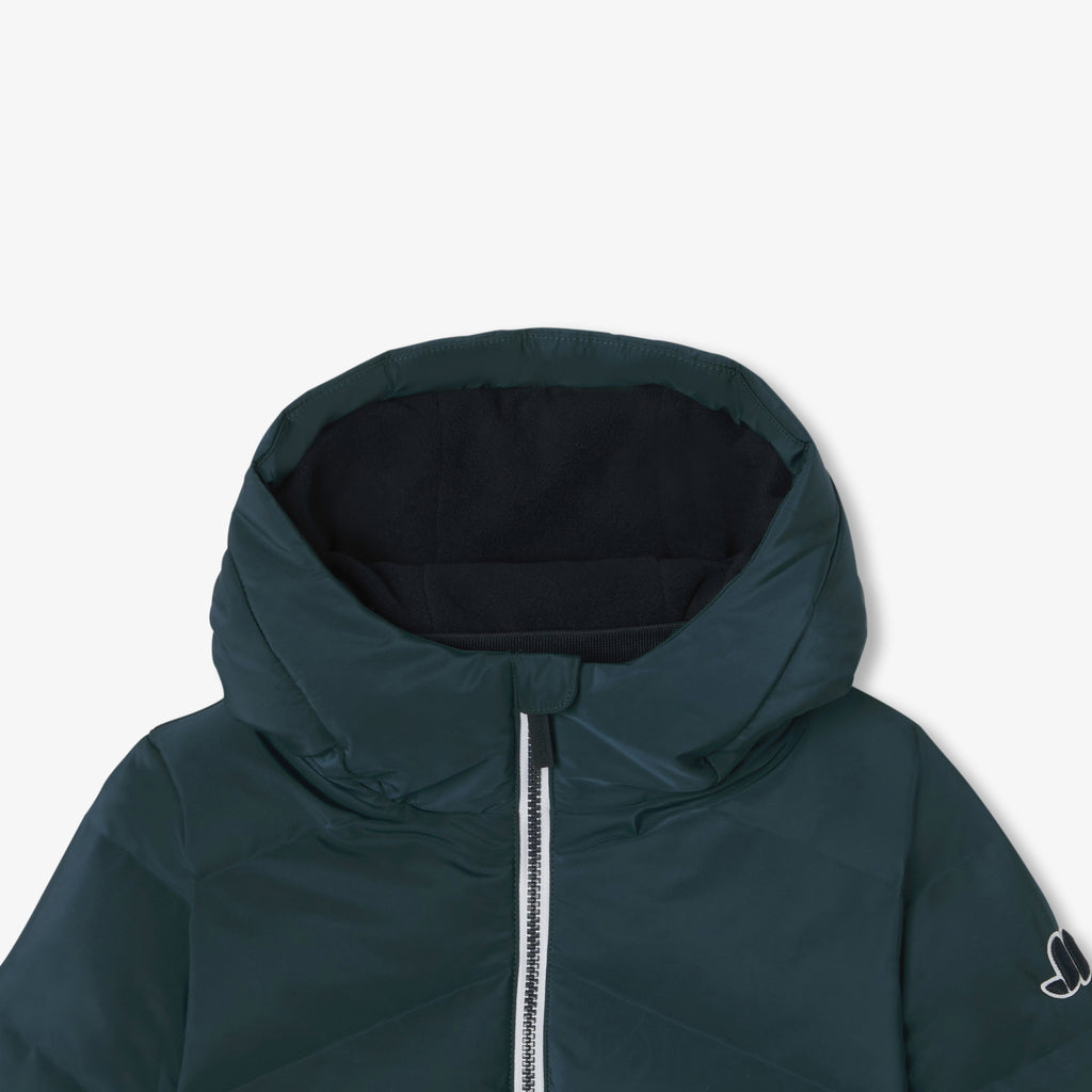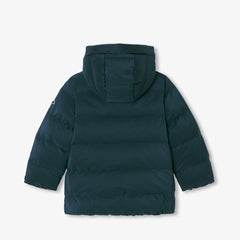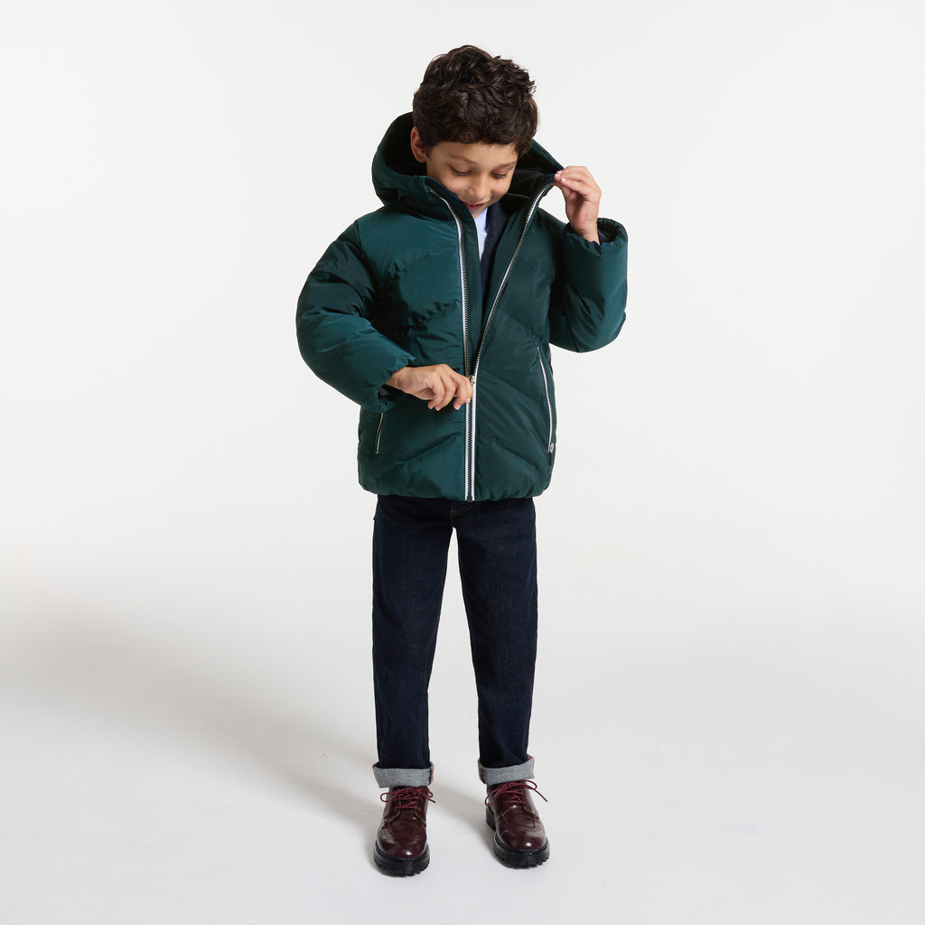 お子さまに大人気のミニマルでスポーティーシックなダウンジャケット。撥水加工のポリエステル製で、マイクロフリースの裏地付き。リサイクルポリエステルの中綿が快適な暖かさをキープします。ジャージーの縁取りの付いたファスナー式フードがアクセントに。秋から冬の寒さをしっかり防ぎ、街中でもスキー場でも活躍する都会的なシルエットの一着です。